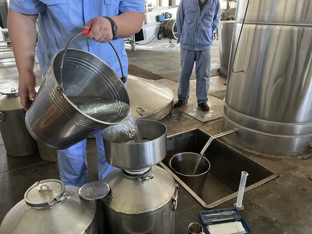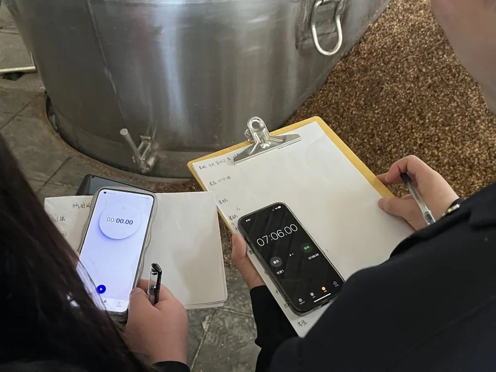 比赛开始前,酿造车间主任、酿造师刘国田公布了比赛规则。选手经过抓阄确定位置后,进行了上甑、摘酒竞赛。选手将粮醅一层一层上甑,保持粮食疏松,随时探气使蒸馏上气均匀;装甑完毕后盖盘进行蒸馏,选手们掐头去尾,分段取酒。