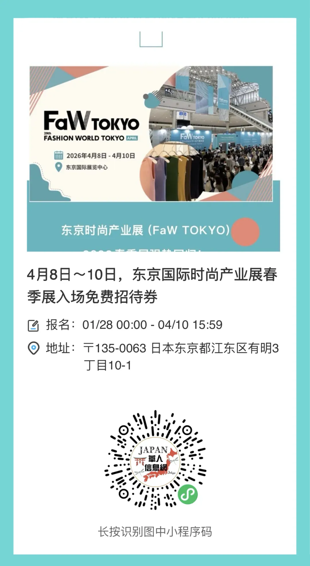 4月8日—10日,日本规模最大的时尚商贸展—东京时尚产业展2026春季展将在东京国际展览中心(东京 Big Sight)举办。