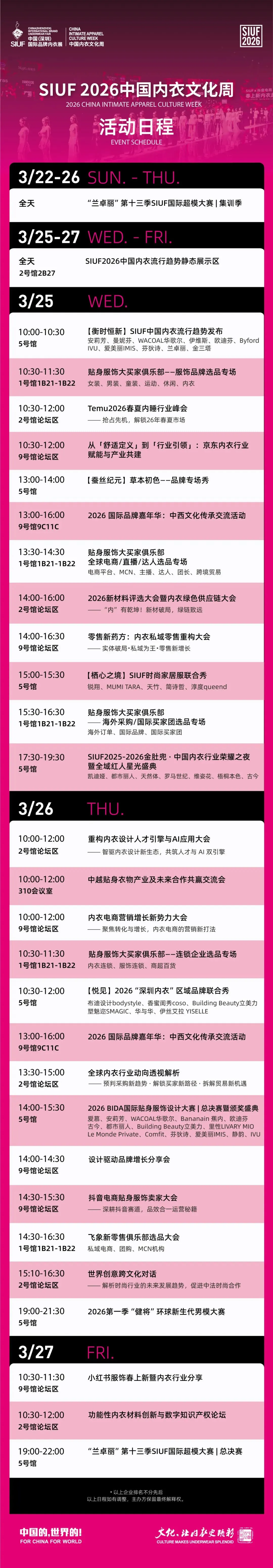 展会期间,超模与男模大赛、行业流行趋势权威发布、产业高峰论坛、品牌及联合时尚大秀、设计大赛、精准选品对接会、“金肚兜” 颁奖盛典以及 SIUF 国际品牌嘉年华等系列活动将密集开展。三日日程覆盖从创意研发、设计创新到市场交易、国际拓展的全产业链核心环节,既展现当下内衣产业的前沿风貌,也为无缝织造企业提供了了解下游需求、对接优质资源的窗口。