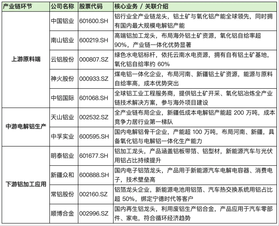 注:中国铝业、南山铝业、云铝股份、神火股份等企业同时覆盖产业链多个环节,表格中按其核心业务属性归类,实际业务涉及上下游多领域布局。