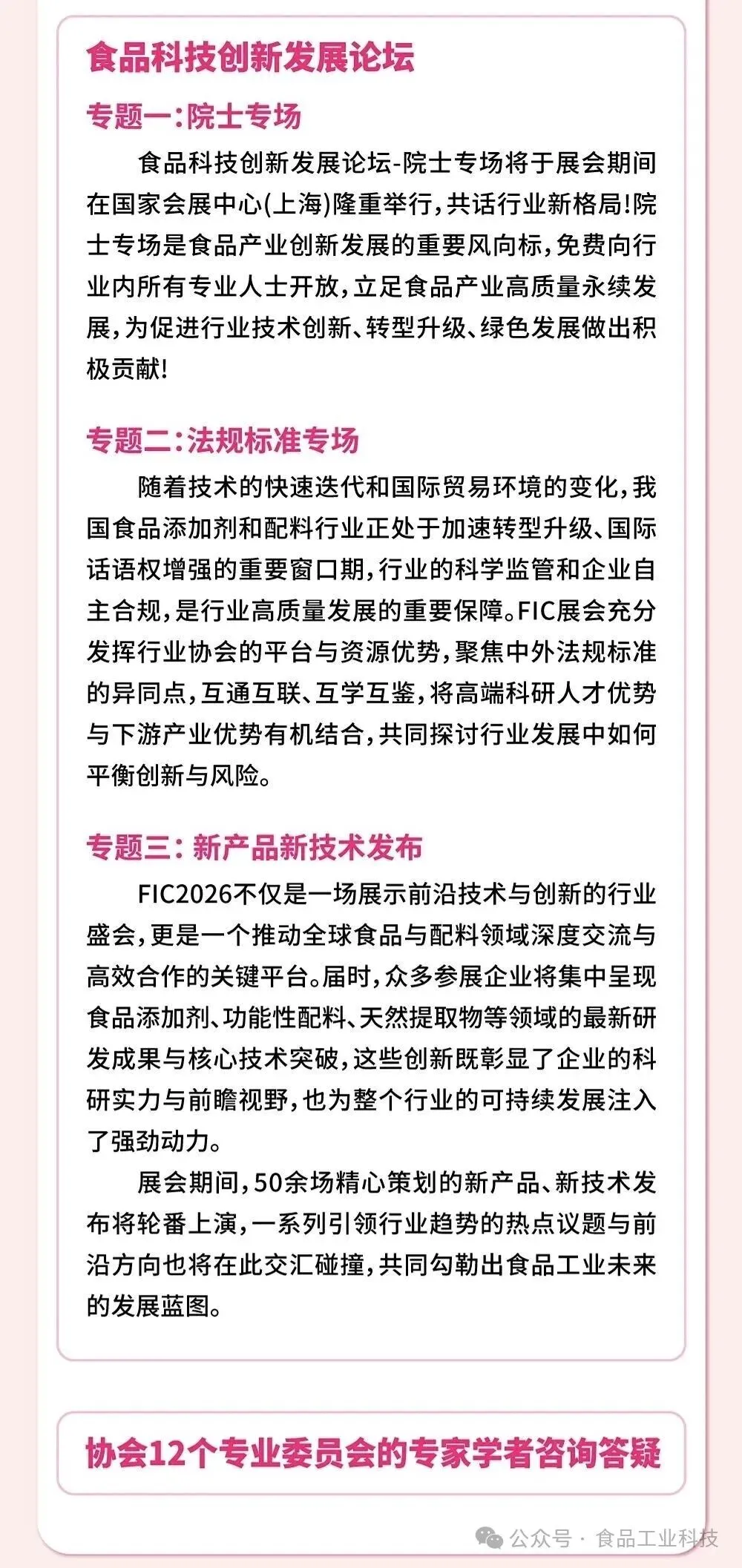 行业盛会,如期而至。第二十九届中国国际食品添加剂和配料展览会(FIC2026)定于2026年3月17日至19日在国家会展中心(上海)举办。本届展会展出面积达170,000平方米,汇聚全球近1,700家行业领军企业,预计将吸引超15万名海内外专业观众共赴盛会,共探行业新机。展会同期将举办备受瞩目的"食品科技创新发展论坛",特邀院士把脉前沿趋势,通过中外法规标准专场解读政策动向,并有超过50场新产品新技术发布,全方位赋能食品工业的创新发展与转型升级。