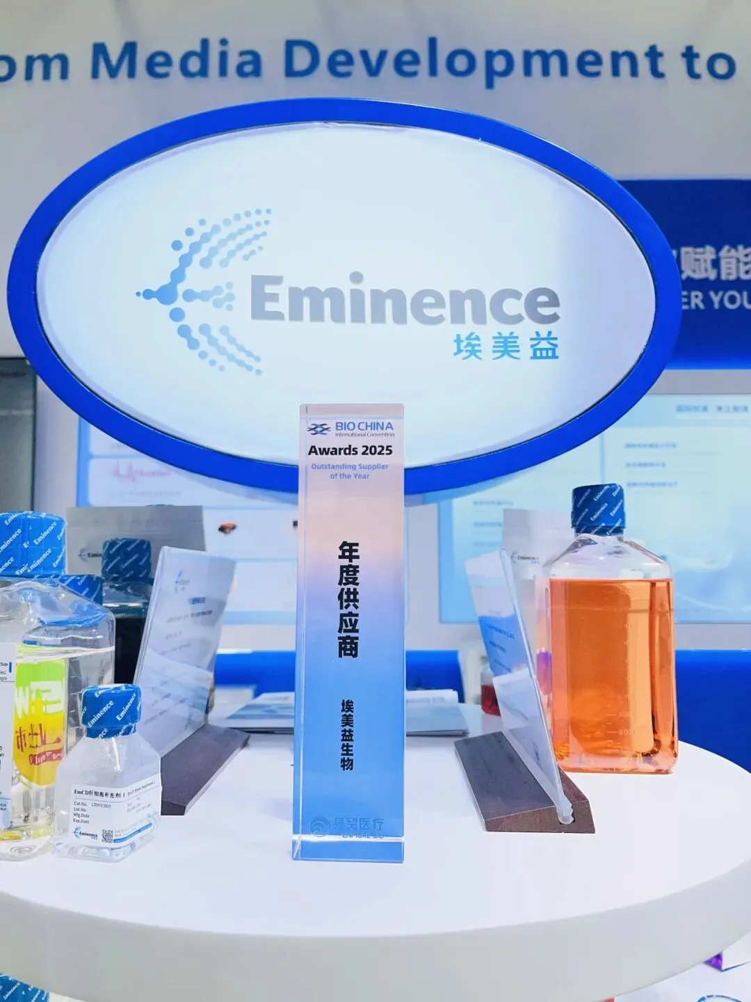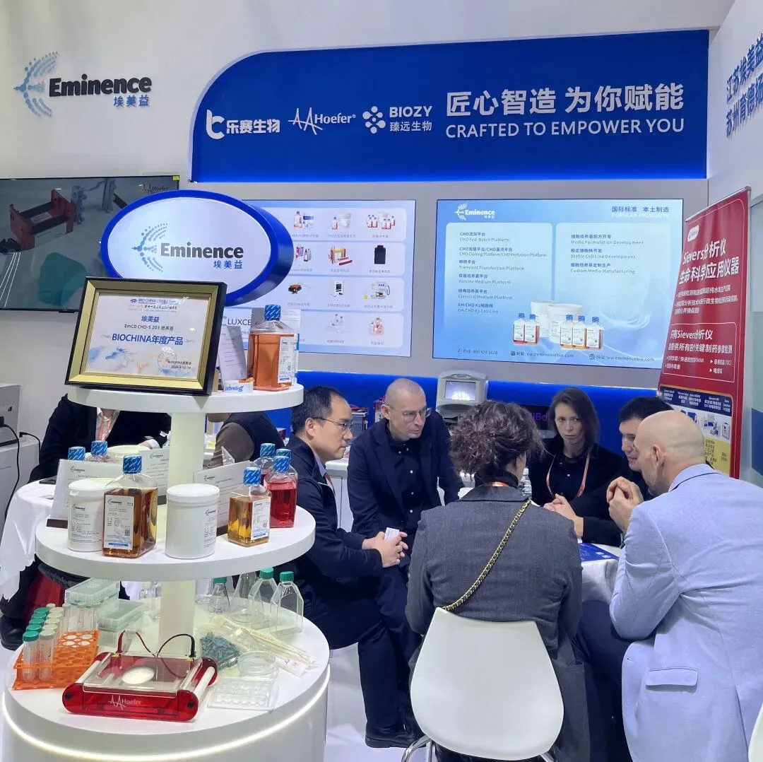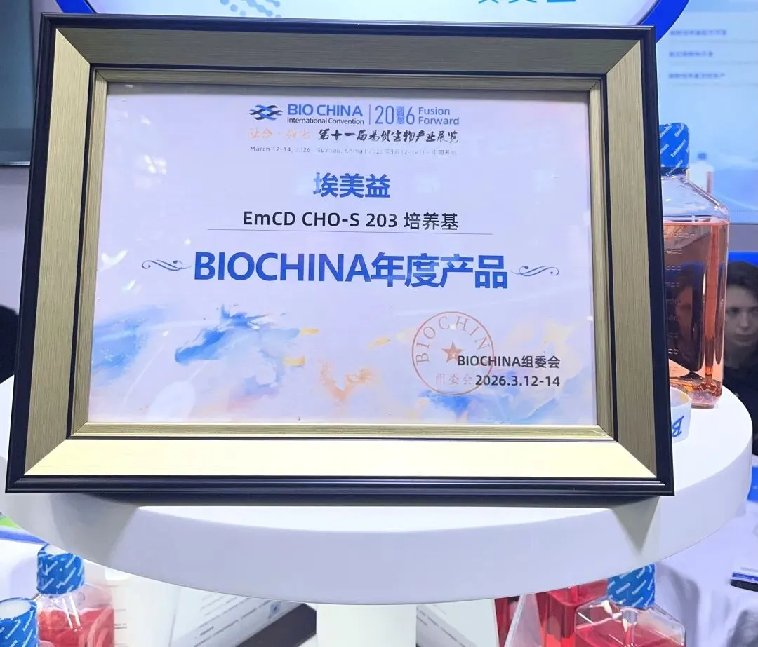 凭借在细胞培养基领域的持续创新和市场表现,埃美益在本届BIOCHINA上荣膺"2025年度供应商”,EmCD CHO-S 203培养基通过现场投票,荣获“BIOCHINA 年度产品”。这是行业对埃美益产品质量、技术服务和供应链能力的高度认可。