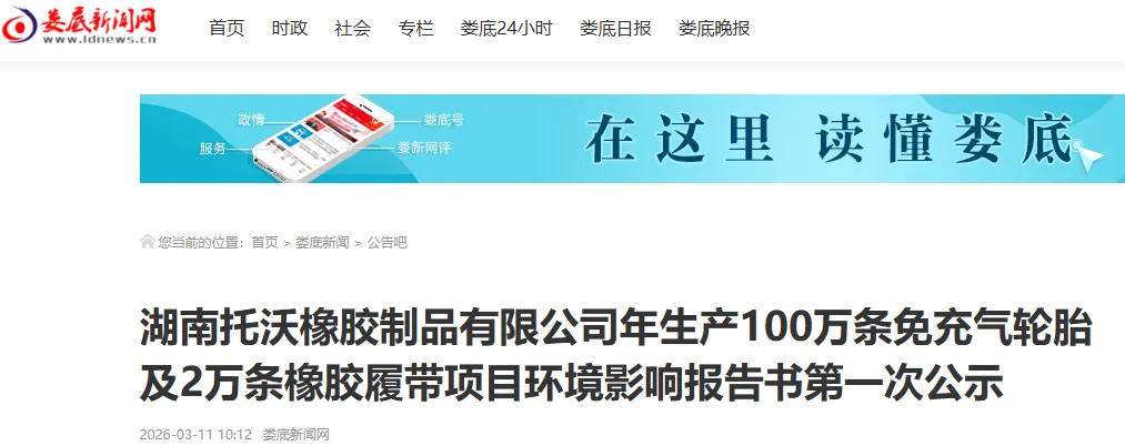 3月11日,湖南托沃橡胶制品有限公司年产100万条免充气轮胎及2万条橡胶履带项目的环境影响报告书,正式启动第一次公示工作。这一举措意味着该企业新建项目的前期筹备环节已步入关键推进阶段,为后续项目落地奠定了重要基础。