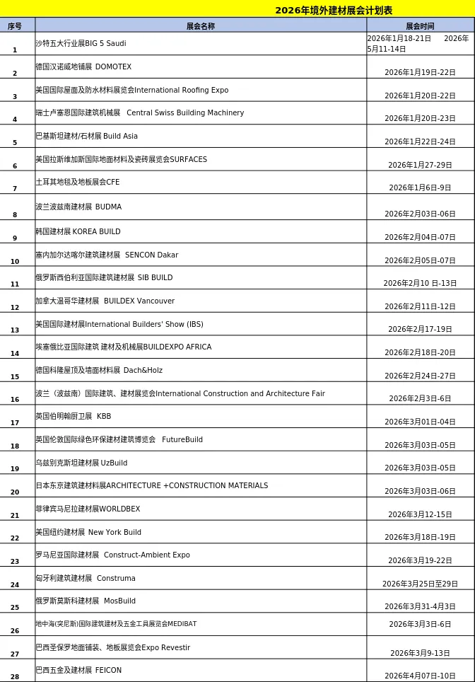 • 建筑材料:混凝土材料、新型地板、屋面和墙体材料、保温隔热材料、防水防火材料、建筑陶瓷与石材、金属及复合材料、密封材料等。