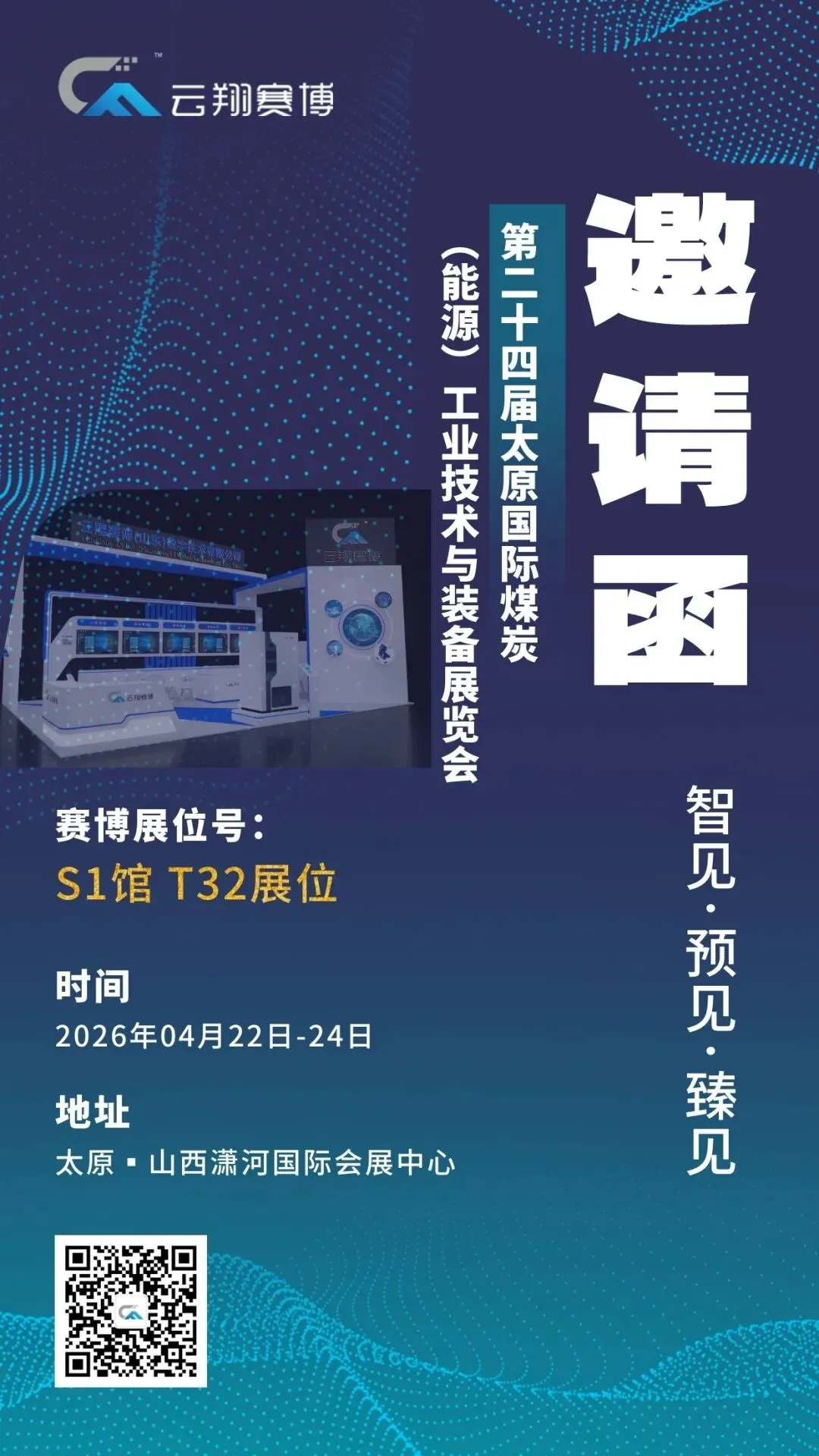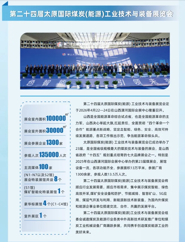 我公司定于2026年04月22日至24日参加山西《第二十四届太原国际煤炭(能源)工业技术与装备展览会》我们的展台设在S1展馆T32展位,诚邀您莅临参观,愿与您共话成果、交流经验,一同见证云翔赛博的成长!