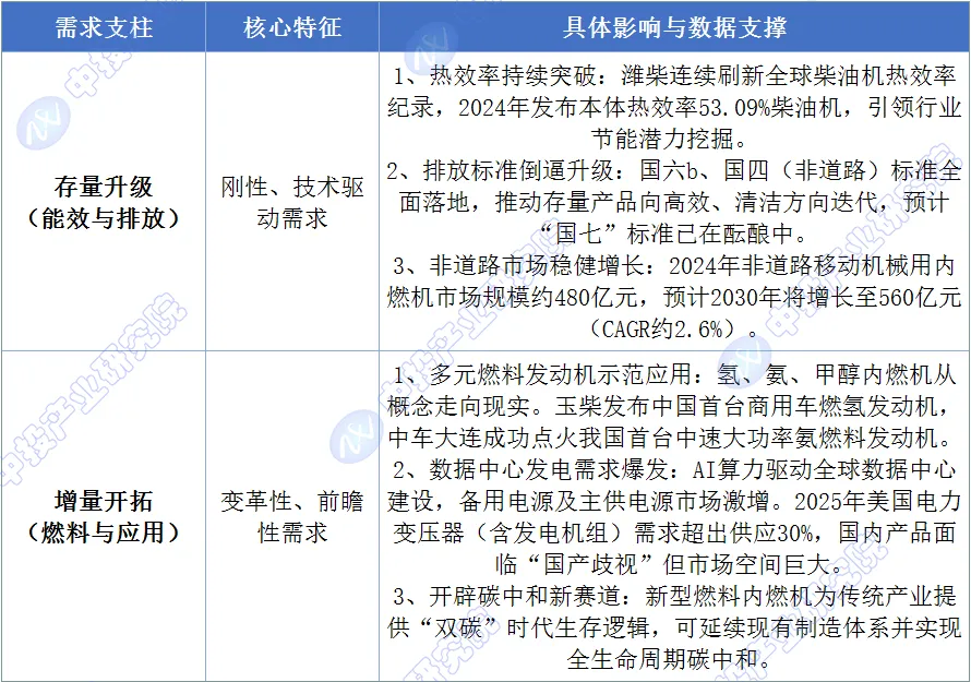 本轮内燃机需求的演变,并非简单的总量萎缩或扩张,而是由存量市场的能效升级需求与增量市场的多元燃料替代需求共同构成,形成了支撑产业未来发展的两大支柱。
