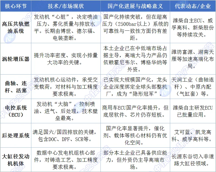 总体评价:核心零部件“卡脖子”风险依然存在,尤其是在超高压力燃油系统、高速电磁阀、ECU芯片等领域,国产化替代仍需持续攻坚。但运动件、基础件等领域已具备全球竞争力,成为中国内燃机产业链的“压舱石”。