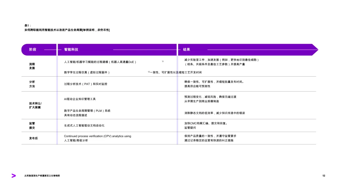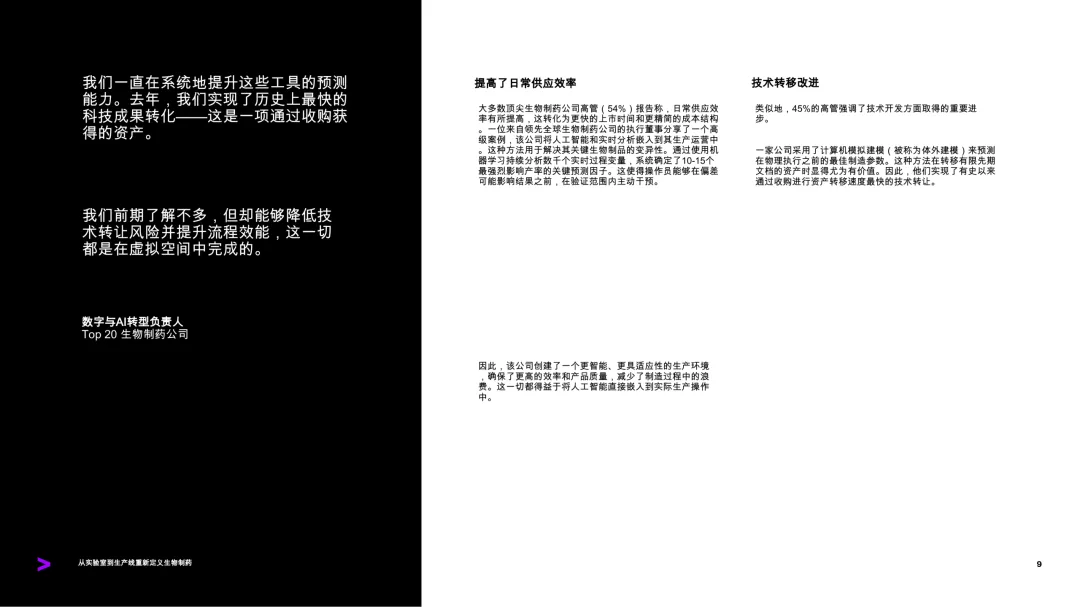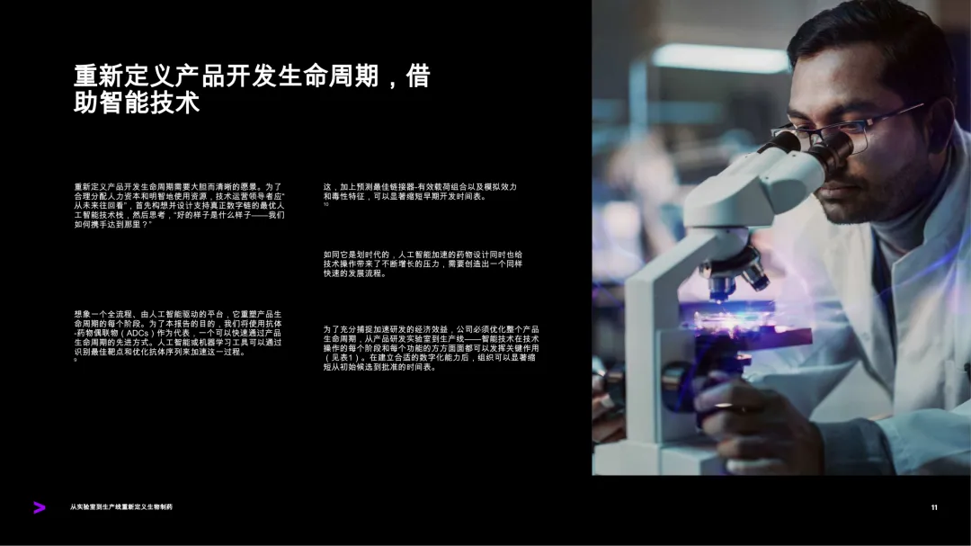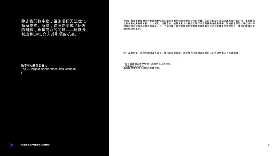 生物制药制造正处于一个关键的转折点,需要从实验室到生产线实现更紧密的整合,以确保速度、可靠性和质量。复杂的生物制剂开发、人工智能加速的研究以及不断上升的地缘政治和经济压力,使制造环节的重要性日益凸显。2024年,64%的药物上市延误与化学、制造和控制问题有关。数字技术的应用仍局限于孤立的项目。即使在那些具备较高数字成熟度的公司中,部分团队使用先进的能力,而其他团队仍依赖传统工具和手动流程。许多潜在的杠杆尚未被充分挖掘,智能技术在更广泛的技术运营中的嵌入仍有巨大潜力。生物制药公司若想充分发挥智能技术的潜力,需在整个产品生命周期中扩展其应用,从机器人辅助的高效工艺设计,到AI驱动的实时分析和决策。基于在多个行业完成的2000多个项目经验,研究指出,构建新一代综合数字生态系统至关重要。该系统应包括先进的分析、人工智能、数字孪生、智能代理和机器人技术,这些技术有望彻底改变生物制药制造和工艺发展。成功的关键在于三个核心领域:以价值为导向的策略、坚实的数据与系统基础,以及对工作流程和工作方式的重新设计。那些打下良好数据基础设施基础的组织,正在获得竞争优势,包括更快的上市时间、更低的生产成本、更高效的流程,以及更可靠的供应保障。数据、人工智能和其他智能技术已在行业中重塑规则。随着这些能力的提升,制造业有潜力成为推动变革的重要引擎,而非限制因素。有目的性地采取行动并保持连贯性的领导者,能够将制造转化为企业创新和持续竞争优势的催化剂。尽管全球调查中有28%的受访者来自顶级生物医药公司,已能使用先进的智能工具支持预测性或部分自主过程,但大多数公司仍处于这些能力的早期扩展阶段。