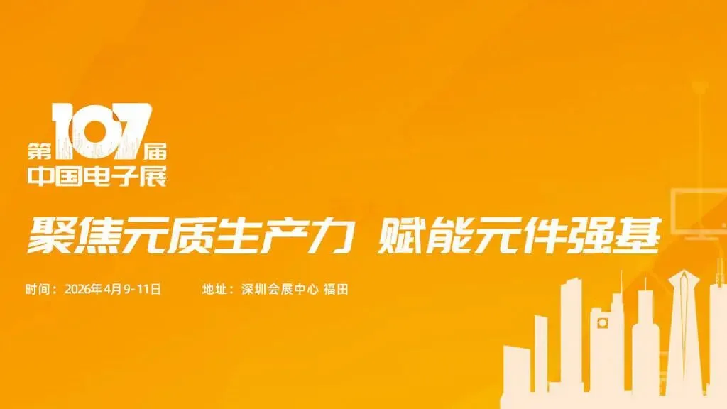 第107届中国电子展将于2026年4月9日至11日在深圳会展中心(福田)举行。本届展会以“聚焦元质生产力 赋能元件强基”为主题,以基础电子元器件为技术牵引,服务于5G、新能源、物联网、大数据、云计算、照明与显示、安防、消费电子、智能制造、能源电子等应用行业。届时将与第十四届中国电子信息博览会、2026春季全国特种电子元器件展同期举办。
