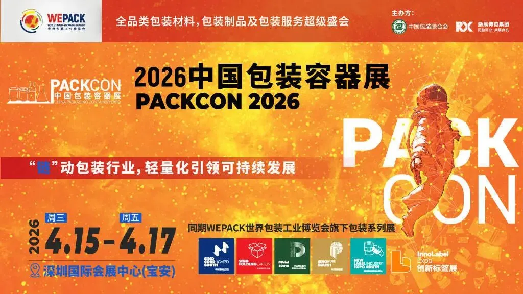 2026年4月15日至17日,PACKCON中国包装容器展将于深圳国际会展中心(宝安)盛大举办。展会由中国包装联合会与励展博览集团联合主办,作为全品类包装容器的一站式商贸采购平台,将集中展示纸、塑、金属、玻璃等材质的创新包装、结构设计及整体解决方案。本届展会规模近13万平方米,汇聚10万余名海内外专业观众,力邀超过3万名来自食品、饮料、日化、电子电器等终端行业的包装决策人参会。