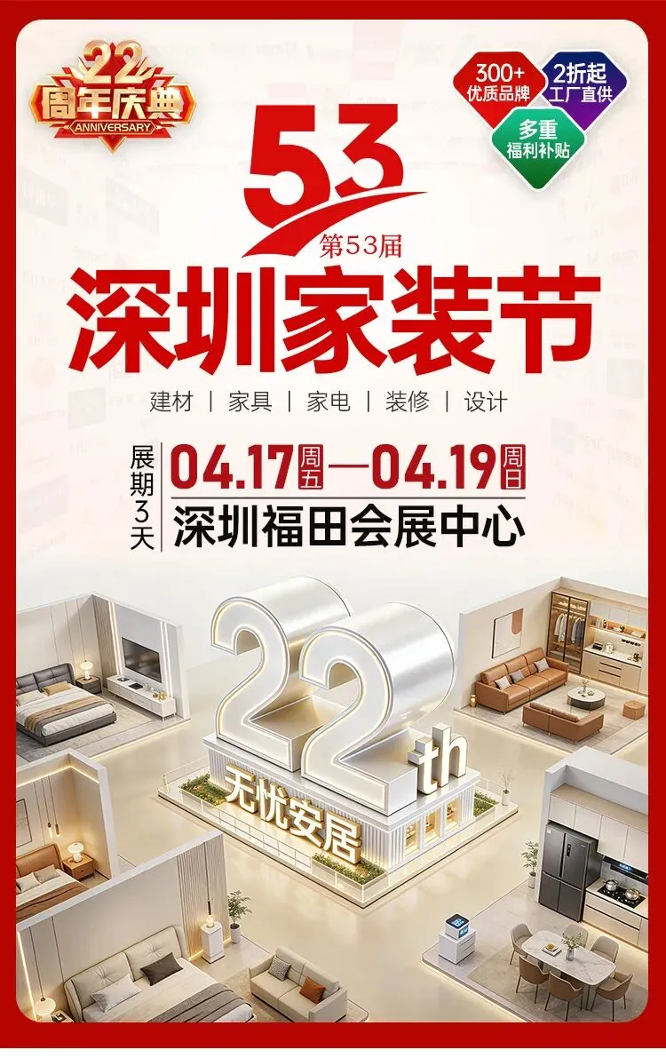 2026深圳家装节将于2026年4月17日至19日在深圳会展中心(福田)举行。针对当下家装过程中建材家具采购分散、价格不透明等痛点,本届展会汇聚众多知名家装建材与家具品牌,从瓷砖、地板、卫浴等基础建材,到沙发、餐桌、衣柜等家具,再到灯具、窗帘等软装,实现全屋家装一站式购齐,让消费者省时省力更划算。