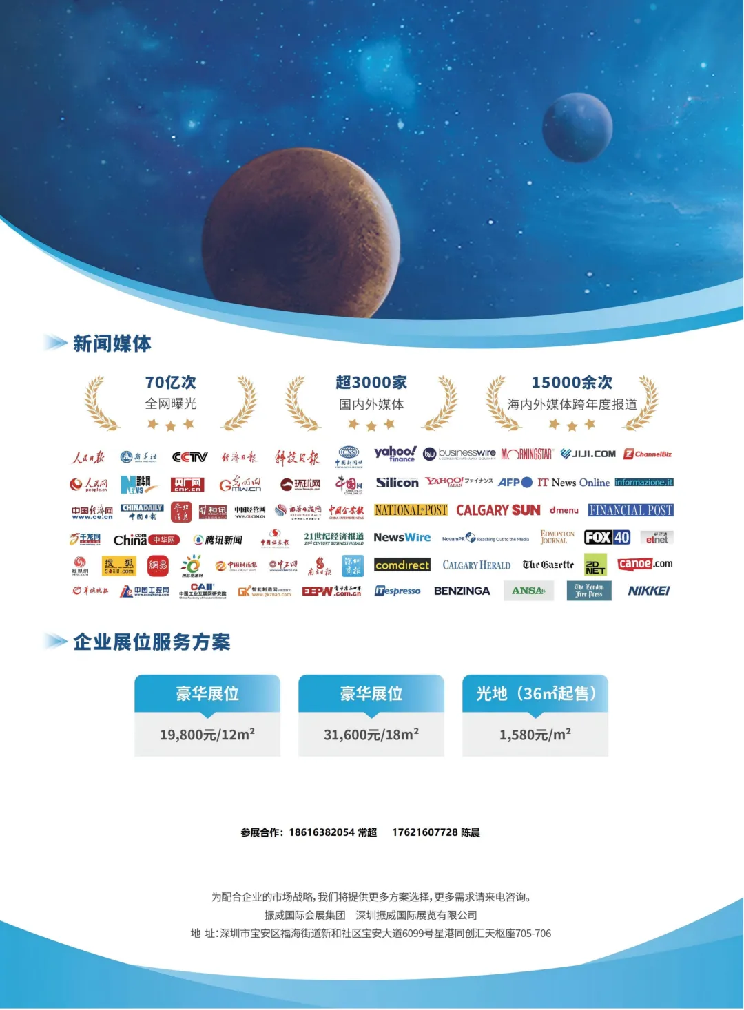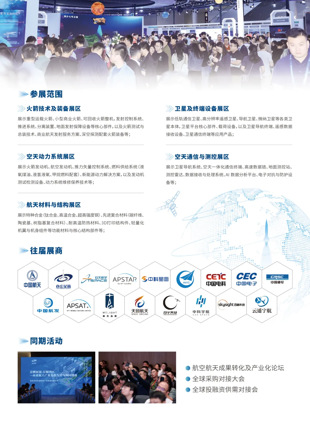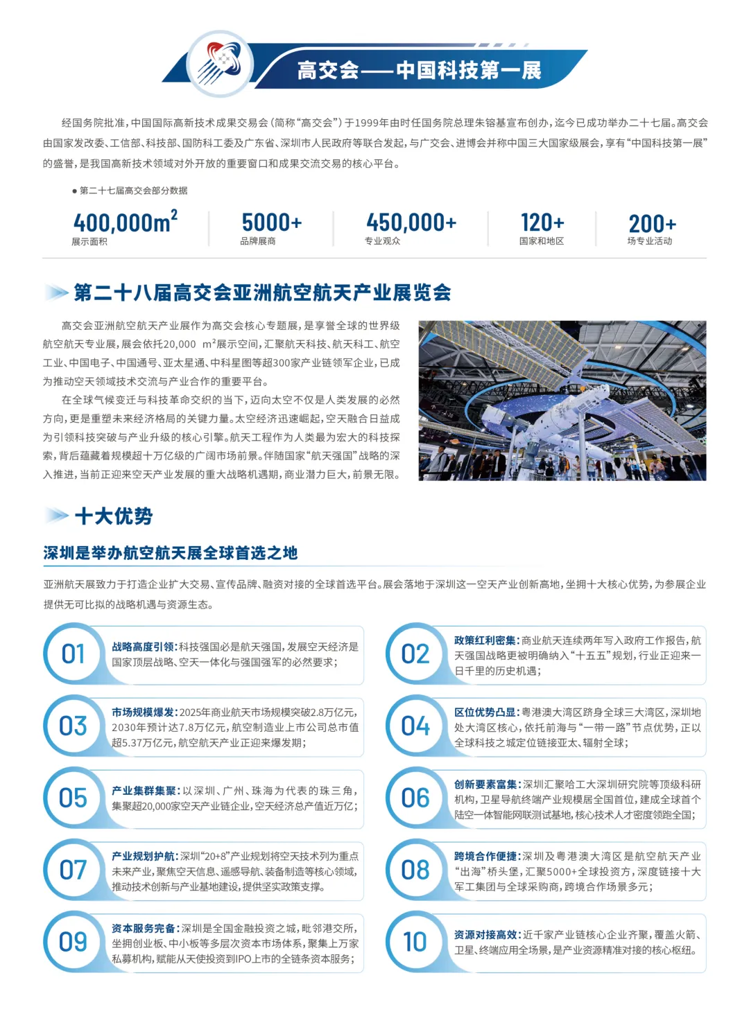 火箭技术及装备展区:涵盖重型运载火箭、可回收火箭、发射控制系统、商业发射服务等全链条展示。卫星及终端设备展区:呈现低轨通信卫星、高分辨率遥感卫星、导航终端、数据接收设备等前沿产品。空天动力系统展区:展出火箭发动机、航空发动机、新能源动力解决方案及测试维修技术。空天通信与测控展区:聚焦卫星导航、空天一体化通信、AI数据分析平台、测控雷达等智能系统。航天材料与结构展区:展示特种合金、复合材料、3D打印结构件等高端材料与轻量化组件。除了硬核的展品展示,展会同期还将举办航空航天成果转化及产业化论坛、全球采购对接大会、全球投融资供需对接会等重磅活动,搭建技术交流、商业合作与资本链接的高效桥梁,助力企业精准链接产业链上下游资源,抢占市场先机。本次展会将联动高交会3000 +家媒体矩阵,70 +亿次全域曝光,15000+次深度报道的媒体资源,让参展企业的品牌影响力与技术实力传遍全球。无论是想展示核心产品、拓展商业版图,还是寻求技术合作、对接优质资本,这场展会都是你的不二之选!十万亿级空天赛道已开启,全球行业精英正集结!诚邀航空航天产业链上下游企业、科研机构、投资机构与行业伙伴,共赴深圳,共探空天奥秘,共筑产业生态,共启未来新篇!