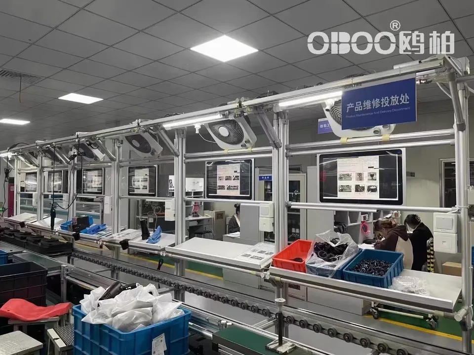OBOO鸥柏丨生产线电子看板引导信息触摸屏一体机展示终端,交互式工业级触摸显示器拉线图纸在线查看,流水线作业指导书信息播放大屏,SPO工位网络大屏支持WIFI及联网内容远程发布;