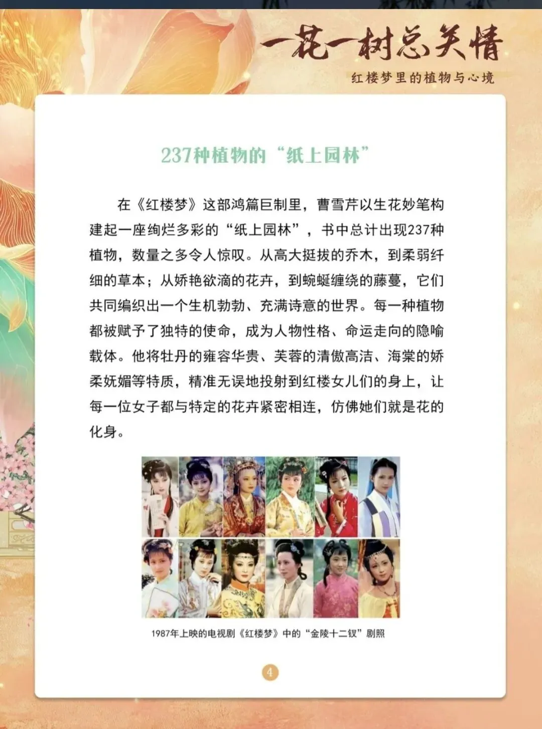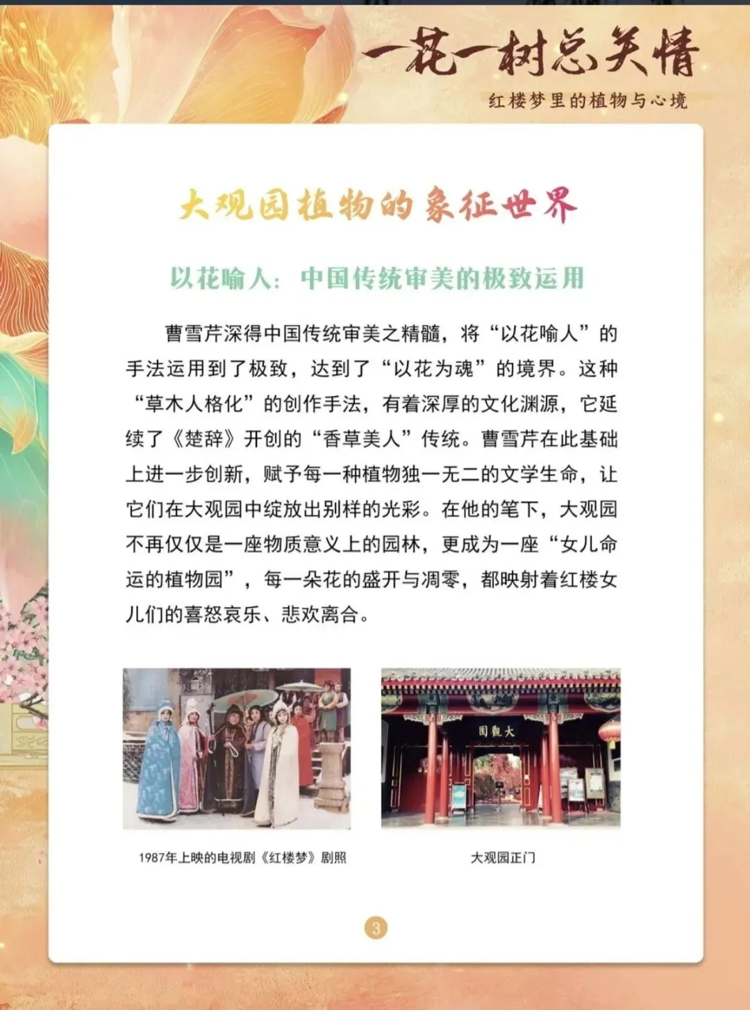 《红楼梦》的叙事肌理中,植物从来不是可有可无的布景,而是浸透着人物心境、暗合着命运走向的精神符号。从绛珠仙草“还泪”的神话开篇,到大观园里“杏帘在望”的田园意趣,再到潇湘馆“凤尾森森”的翠竹环绕……作家曹雪芹以草木为笔,将细腻的情感藏于花叶枯荣之间。黛玉葬花时的“花谢花飞飞满天”,既是对落花的怜惜,更是对自身漂泊命运的悲叹;宝钗居所“蘅芜满净苑”的冷香,暗合其“任是无情也动人”的内敛心性;探春院中“有凤来仪”的梧桐,隐喻其“才自清明志自高”的抱负。这些植物不再是自然之物,而是人物心境的外化、性格的注脚。本展览便循着红楼中的草木踪迹,探寻植物意象与人物心境的深层关联,感受曹雪芹以花树传情的文学匠心。