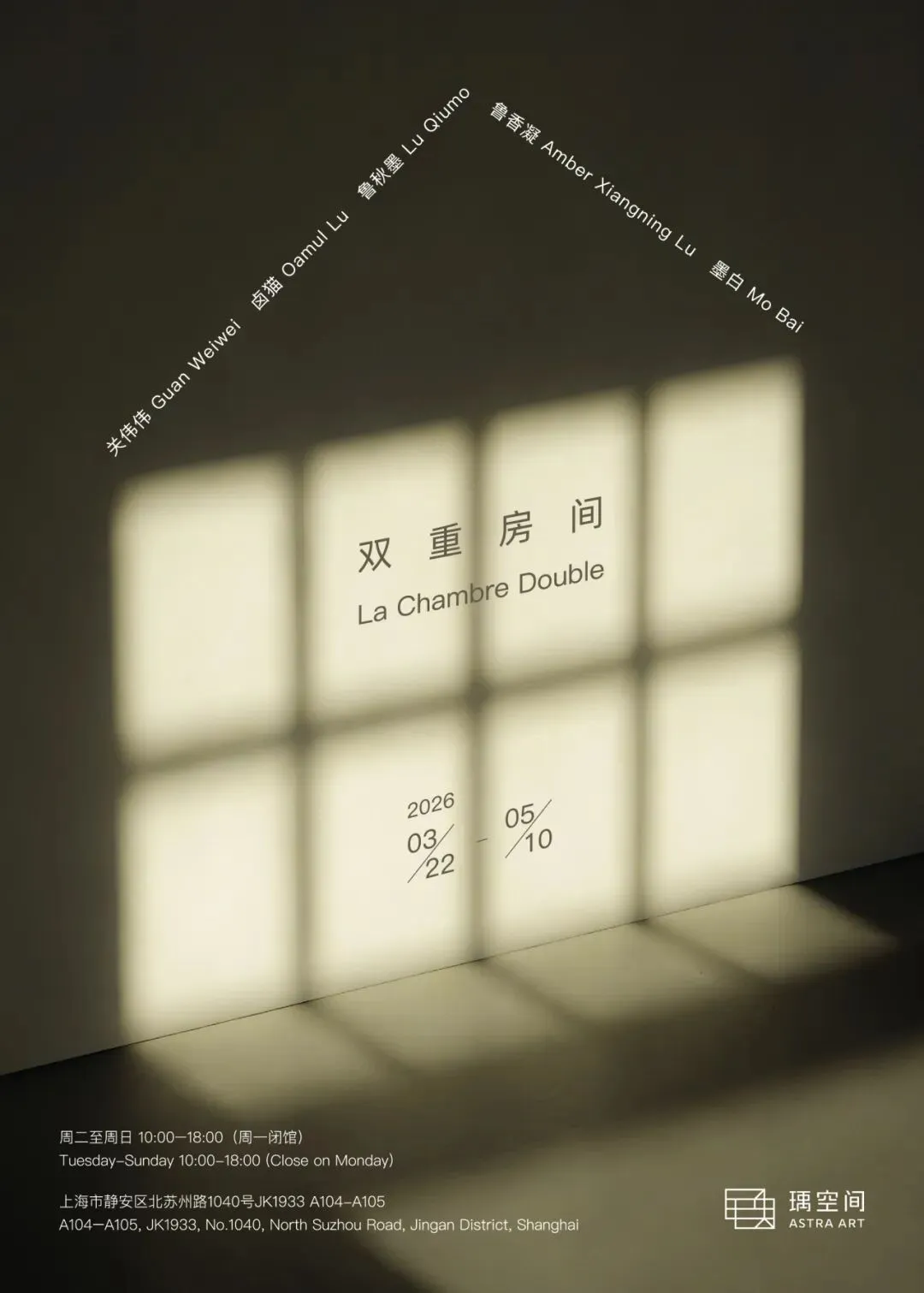 瑀空间 ASTRA ART 欣然宣布新展《双重房间》将于2026年3月22日正式开幕。本次群展将集中呈现艺术家关伟伟、卤猫、鲁秋墨、鲁香凝与墨白的近期创作。以丰富的叙事和多元的媒介,邀请观者步入一场关于日常空间的深度探索。