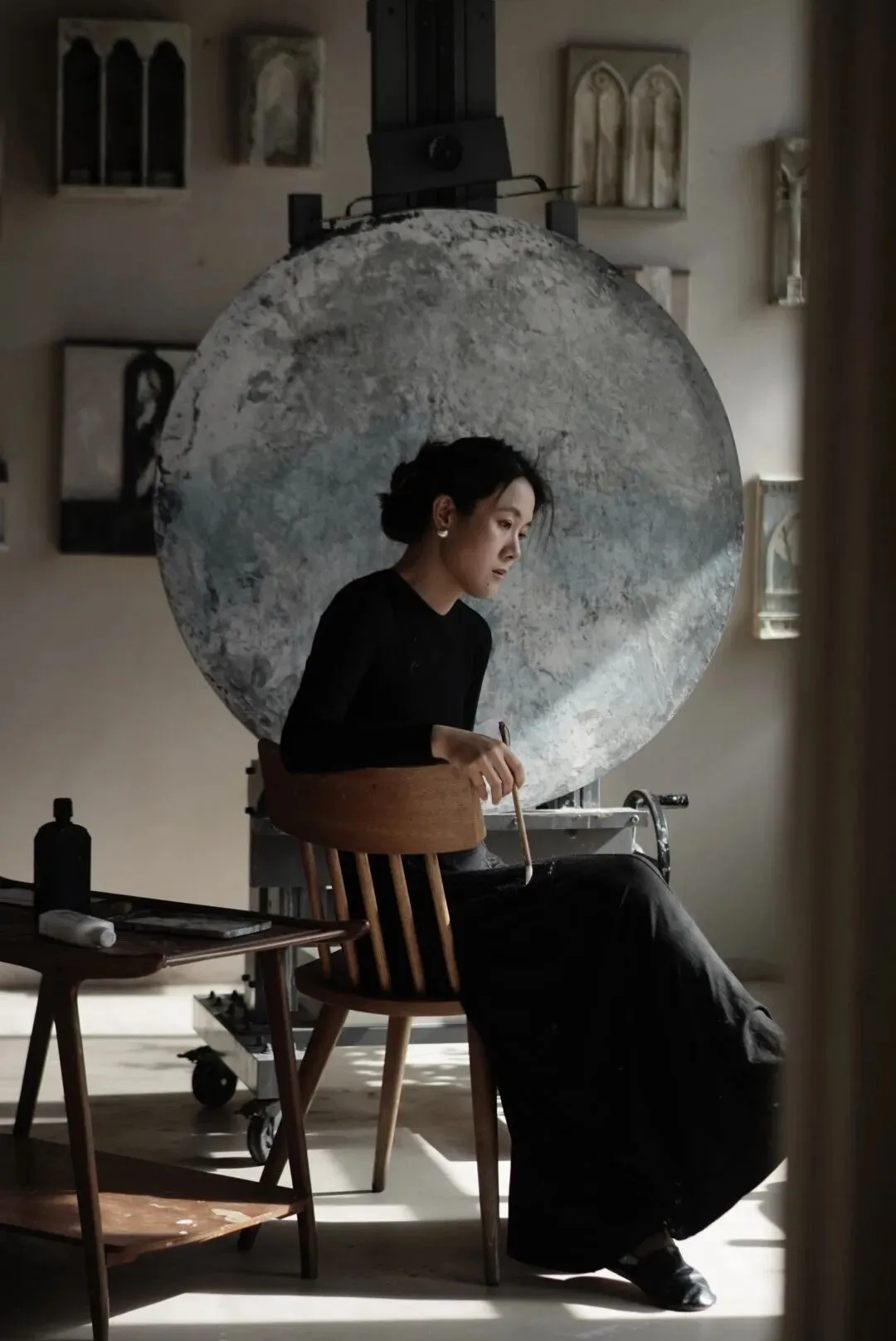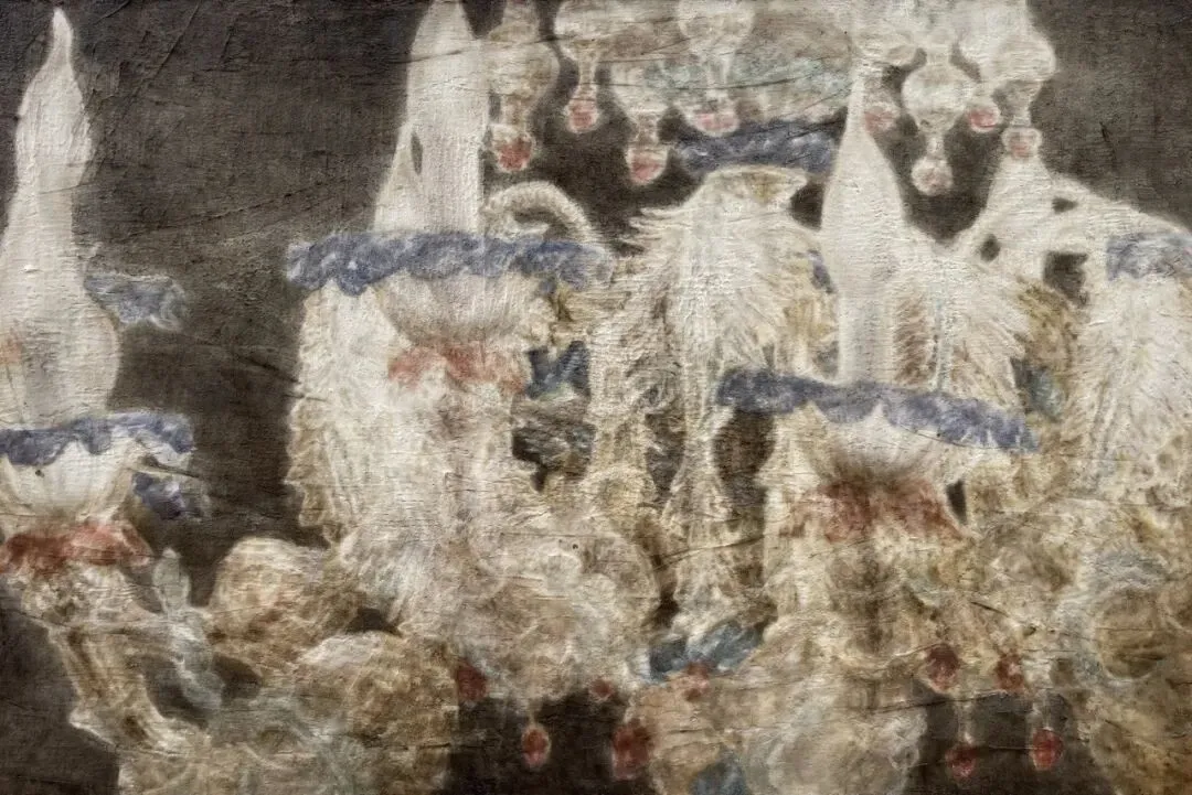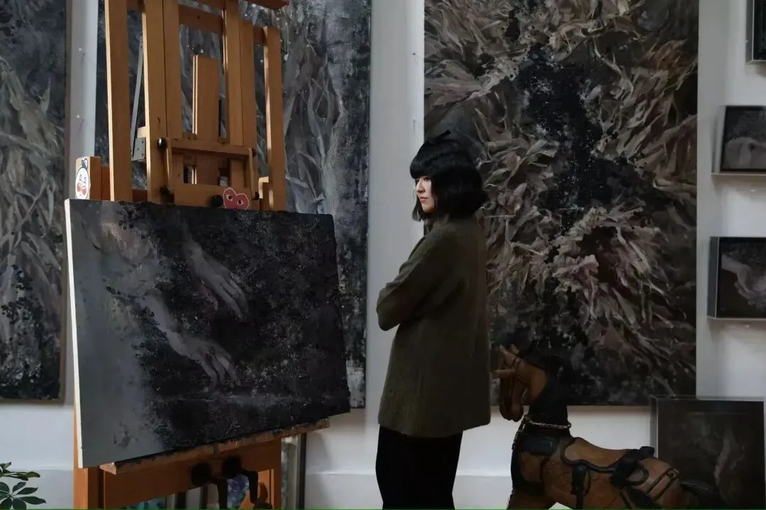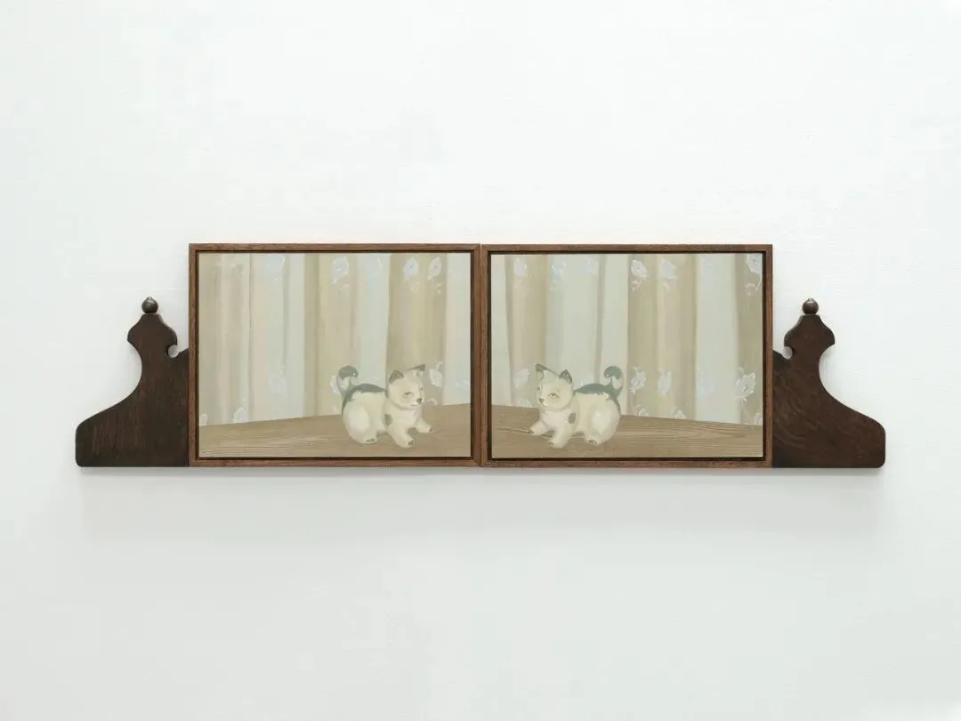 她的作品用虚幻的类似湿壁画一样的质感处理图像,以独特的视觉语言探索记忆与真实的边界,将图像直接失真,虚幻的呈现于观众眼前。她将源于14、15世纪的坦培拉技法在原有的基础上创新延续,绘就虚无的边界:远观时,作品如记忆缘起般具象存在;走近细察,具体形象却逐渐消解于朦胧之中。