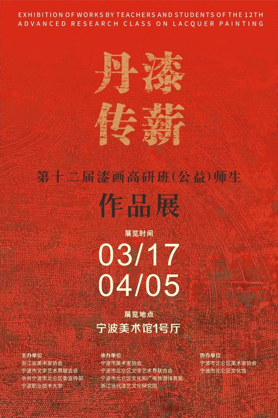为持续培养全国各地青年漆画人才,中国美协漆画艺委会于2025年夏天在宁波职业技术大学成功举办了第十二届漆画高研班(公益)。为深入学习贯彻党的二十大精神和习近平总书记关于文艺工作系列讲话精神,弘扬中华传统文化,持续深入打造中国青年漆画品牌,浙江省美术家协会,宁波市文学艺术界联合会、宁波市北仑区委宣传部、宁波职业技术大学拟举办 丹漆传薪--第十二届漆画高研班(公益)师生作品展。通过展览全面展示第十二届漆画高研班学习成果,促进艺术交流与合作,提升公众对当代漆画艺术的认知和欣赏水平,为推动当代文化艺术的繁荣发展发挥积极作用。中共宁波市北仑区委宣传部