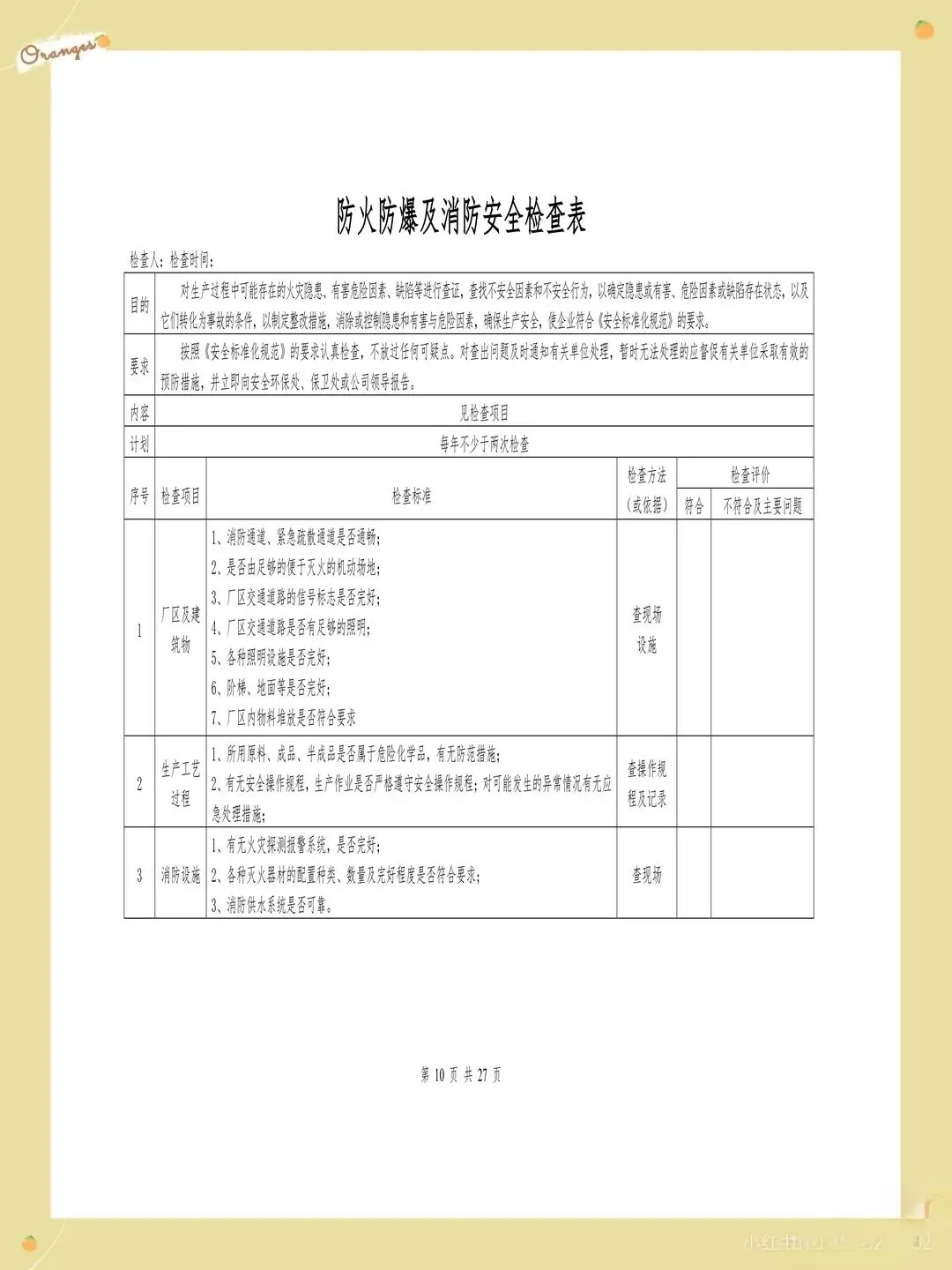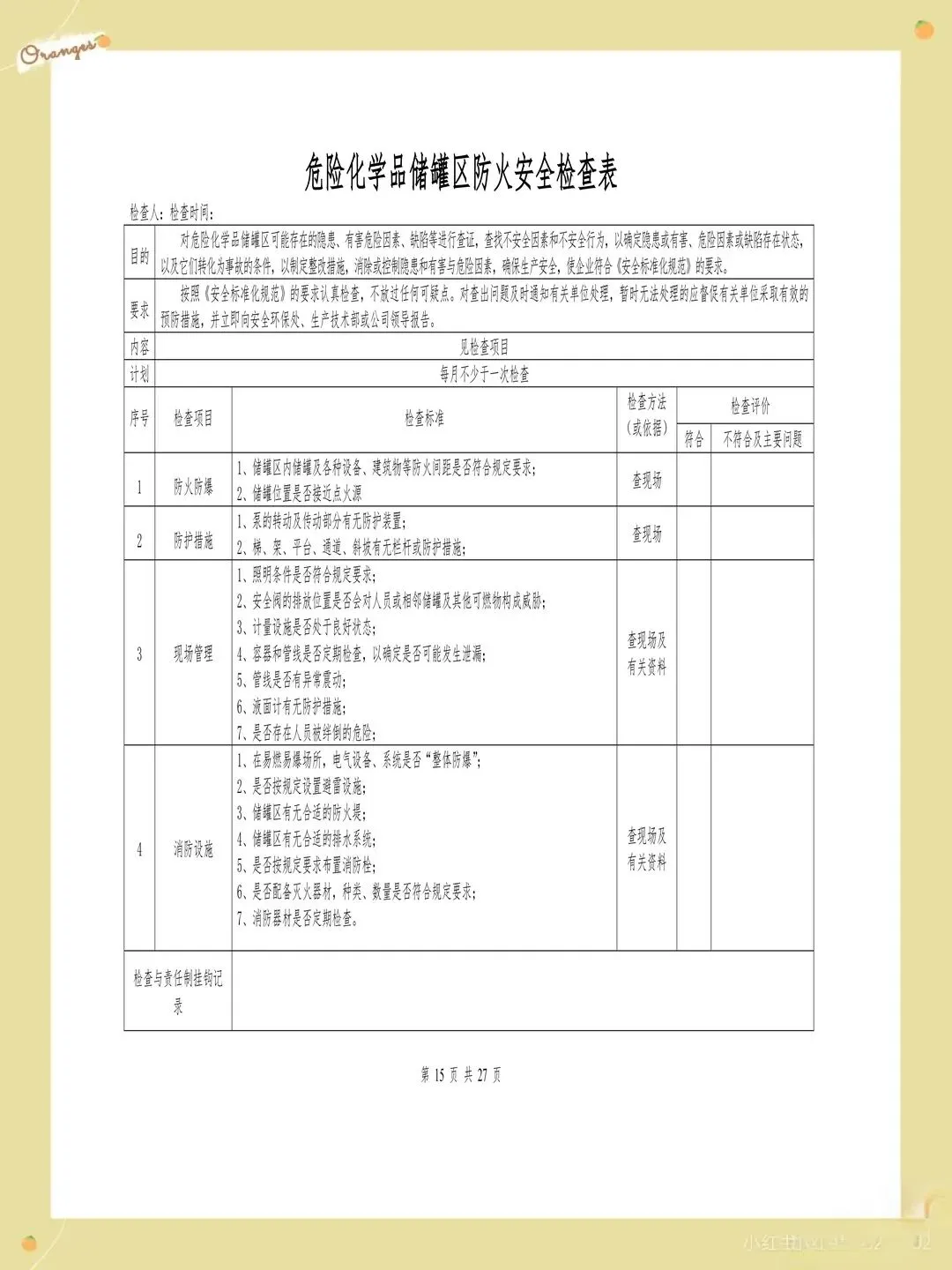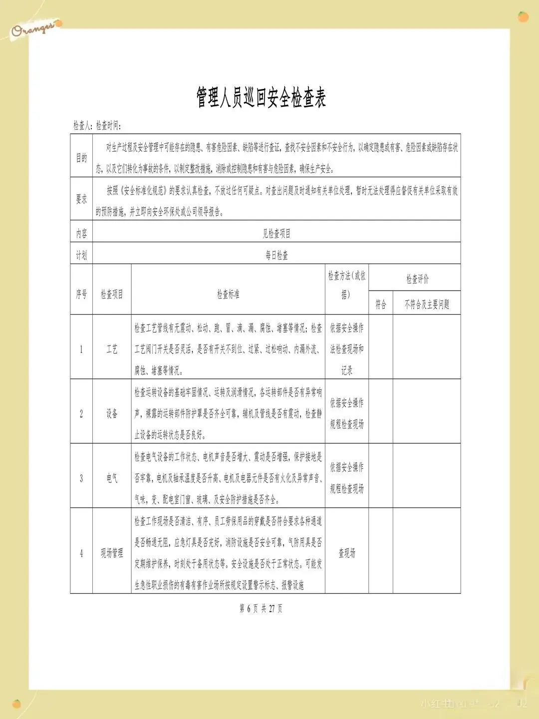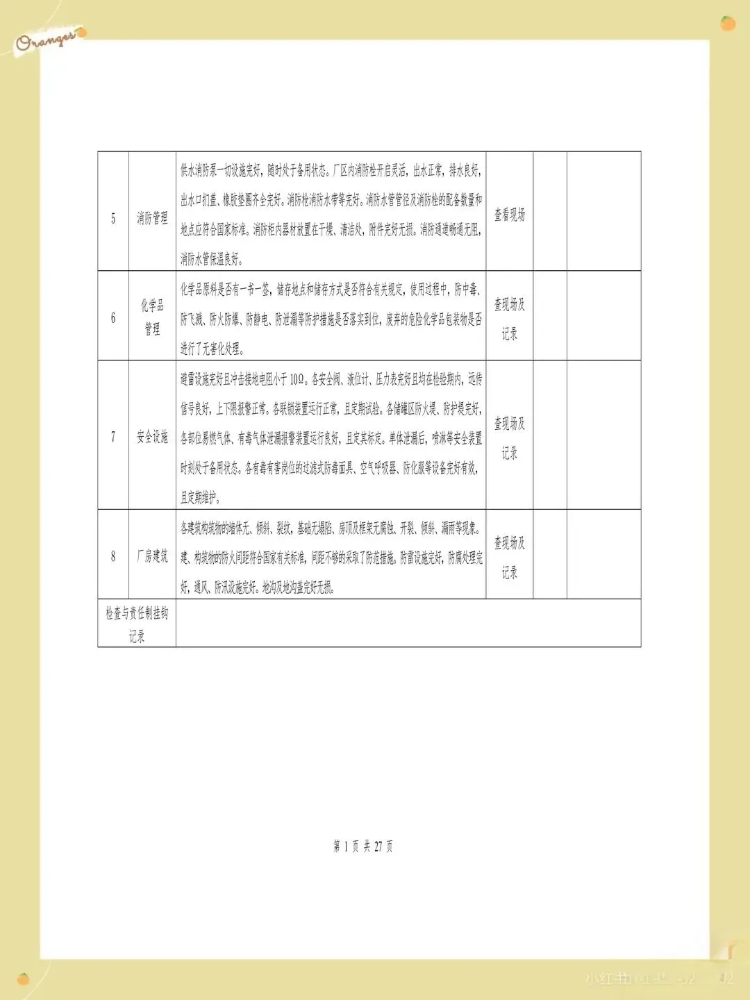很多企业的检查表存在检查项目过于笼统的问题,比如只写"消防设施完好",却没有具体说明要检查哪些消防设施,完好标准是什么。这样的检查项目导致检查人员只能凭主观判断,检查结果的一致性和可靠性都难以保证。每个检查项都应该有具体的检查内容和判定标准,比如"灭火器压力在正常范围内,喷嘴无堵塞,瓶体无锈蚀"。