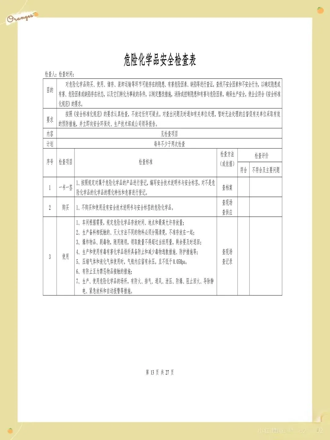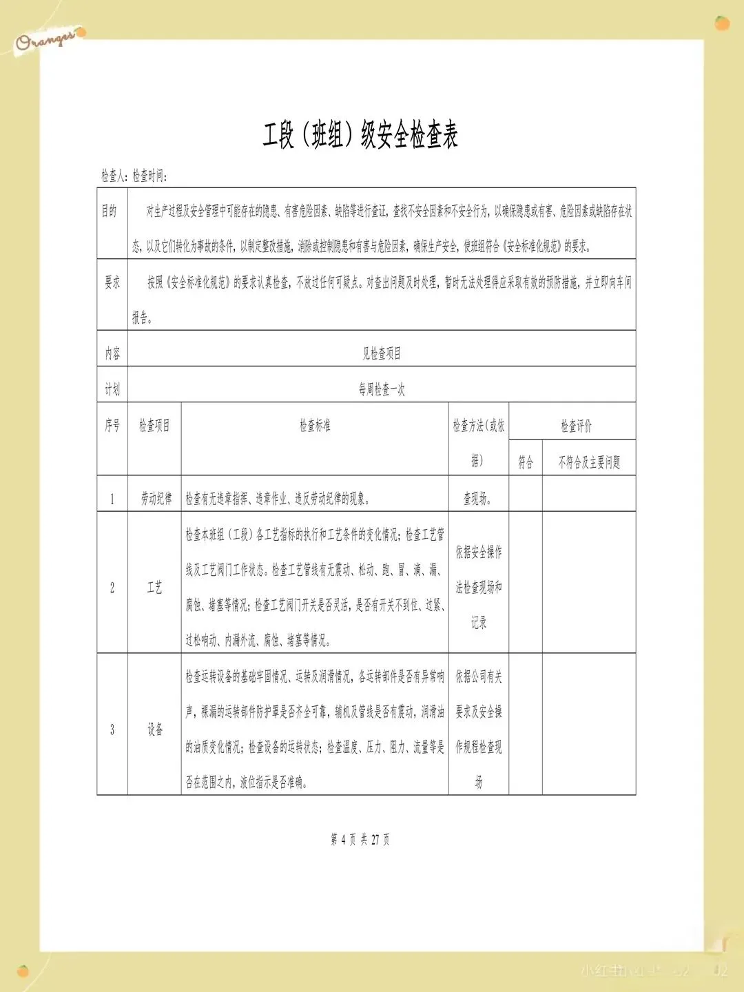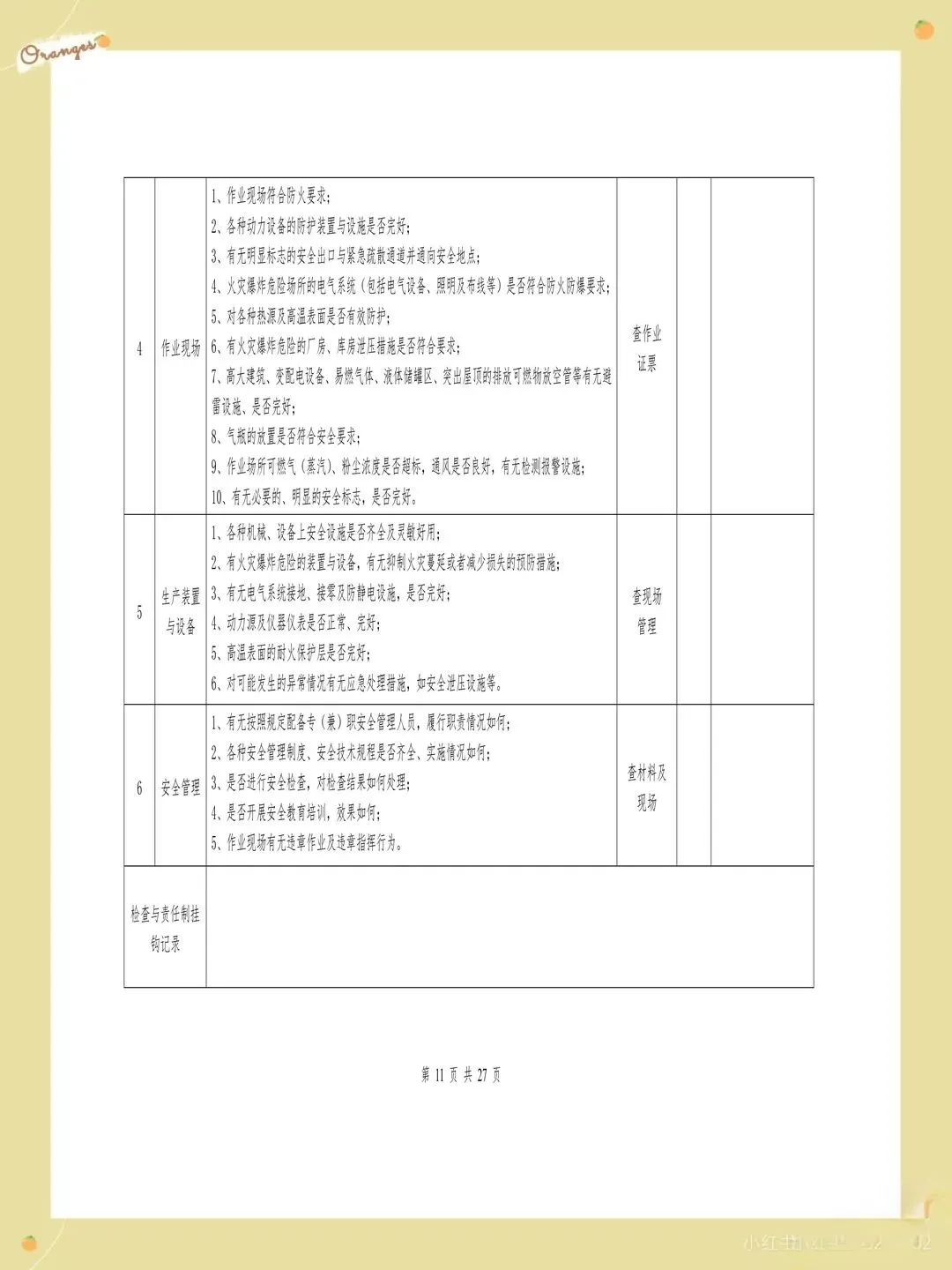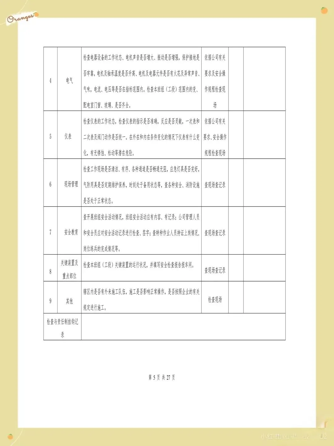 很多企业的检查表存在检查项目过于笼统的问题,比如只写"消防设施完好",却没有具体说明要检查哪些消防设施,完好标准是什么。这样的检查项目导致检查人员只能凭主观判断,检查结果的一致性和可靠性都难以保证。每个检查项都应该有具体的检查内容和判定标准,比如"灭火器压力在正常范围内,喷嘴无堵塞,瓶体无锈蚀"。