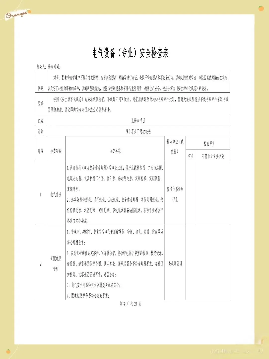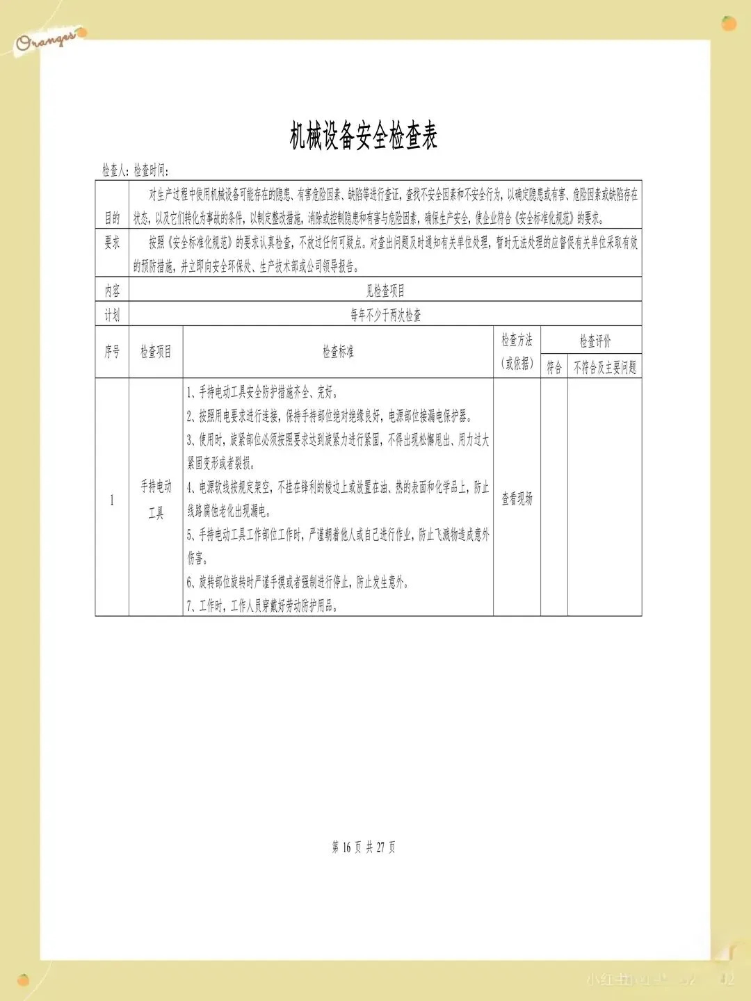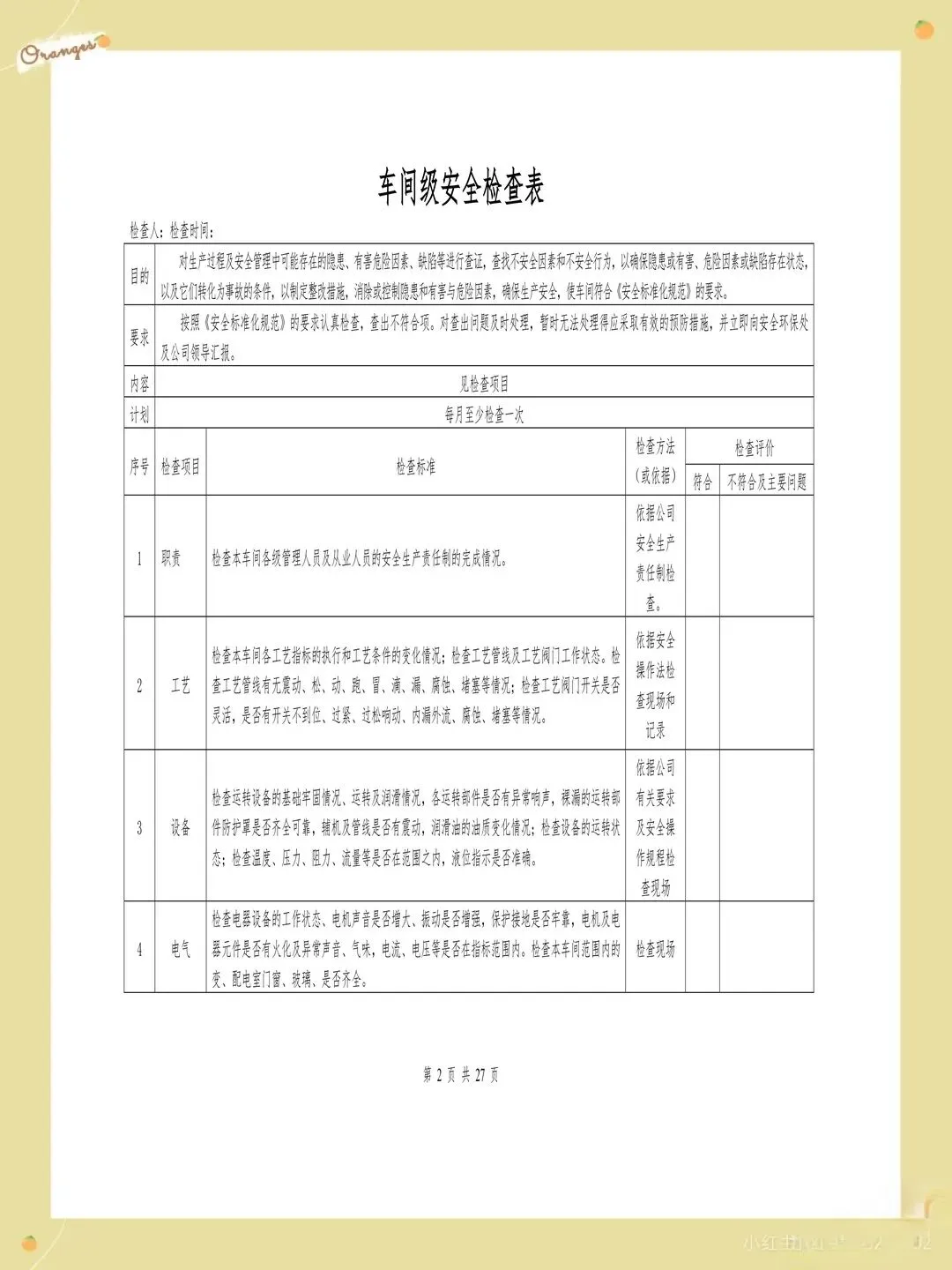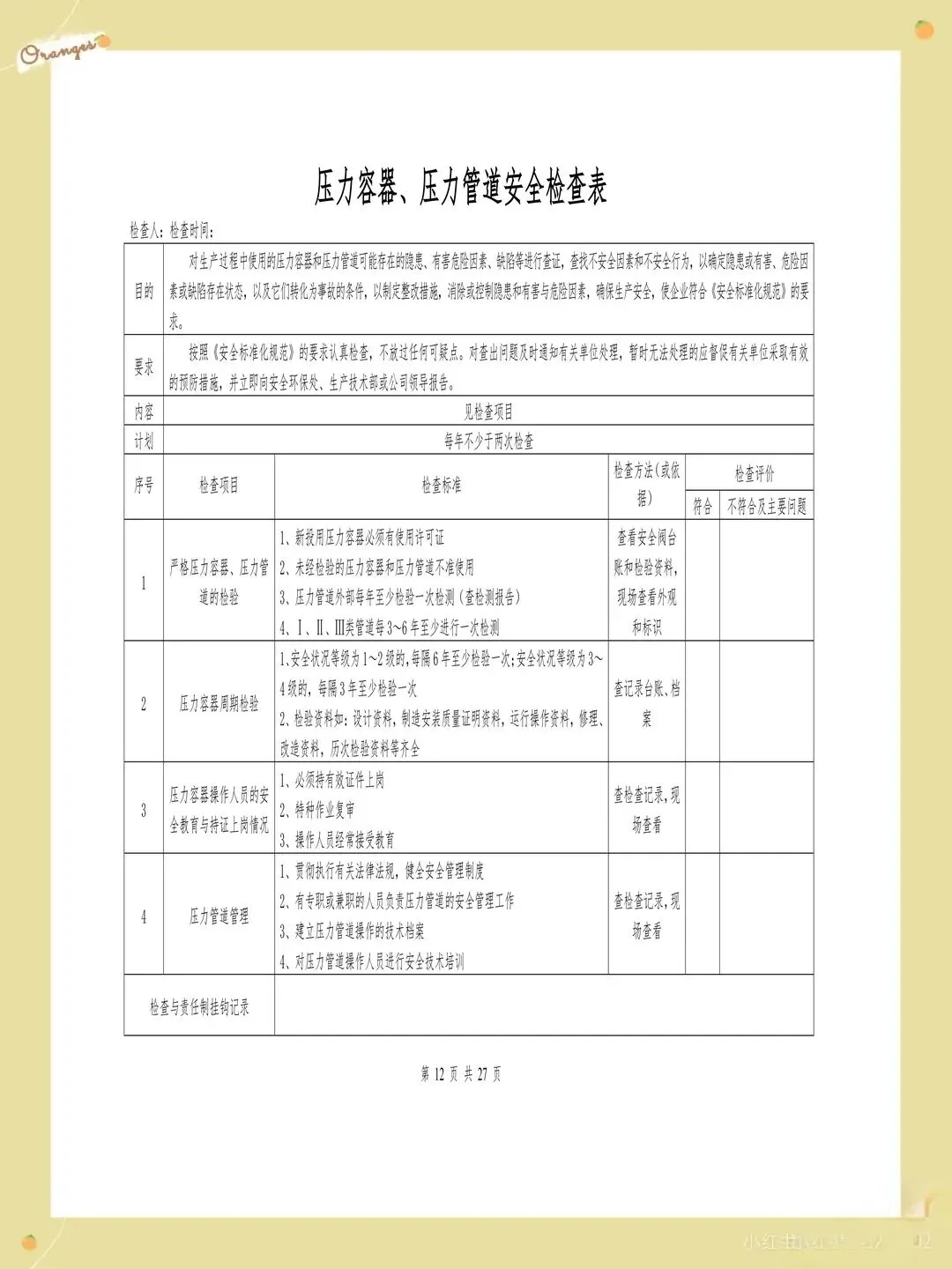 很多企业的检查表存在检查项目过于笼统的问题,比如只写"消防设施完好",却没有具体说明要检查哪些消防设施,完好标准是什么。这样的检查项目导致检查人员只能凭主观判断,检查结果的一致性和可靠性都难以保证。每个检查项都应该有具体的检查内容和判定标准,比如"灭火器压力在正常范围内,喷嘴无堵塞,瓶体无锈蚀"。