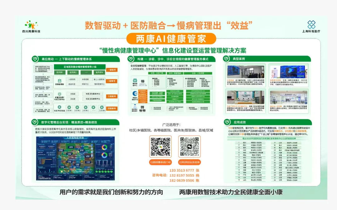 我司加入四川省卫生信息协会会员,亮相信息化与网络安全专委会成立活动,重磅推广两康AI健康管理系统。近日,四川省卫生信息协会信息化与网络安全专业委员会成立活动圆满举行。我司作为入会会员单位应邀出席,与行业专家、医疗机构代表齐聚一堂,共话卫生健康信息化与网络安全发展新路径,现场重点推介医防融合慢病管理系统、两康AI健康管家及慢阻肺全流程管理方案三大核心产品,助力四川基层医疗数智化升级。活动现场,我司展示的产品引发广泛关注。医防融合慢病管理系统聚焦基层慢病管理碎片化、协同性弱痛点,构建数智融合模式,打通筛查、诊疗、随访、康复全流程,实现数据互通、路径优化、监管精准,为基层医疗机构提供一体化慢病管理解决方案。两康AI健康管家以AI技术为核心,通过“数据+算法+服务”闭环,为慢病患者生成个性化健康方案,同时赋能家庭医生团队开展高效干预,真正实现“未病先防、既病防变”。针对慢阻肺高发趋势,我司同步推广慢阻肺全流程管理方案。该方案融合AI辅助诊疗、智能教药、数字疗法三大模块,可精准识别高危人群、生成专业诊疗建议、标准化指导吸入给药,结合月度评估与风险预警,构建“筛查-诊疗-干预-随访”闭环管理体系,切实提升基层慢阻肺规范化管理水平。作为协会会员,我司将依托协会平台优势,深化与省内医疗机构的合作交流,持续迭代产品技术,以数智化力量赋能“医防融合”落地,助力四川省卫生健康信息化与网络安全建设迈上新台阶,为守护民众健康贡献企业力量。感谢新老客户的支持与信任,三天的展会我们收获颇丰,四川两康将继续深耕,不负期待!
