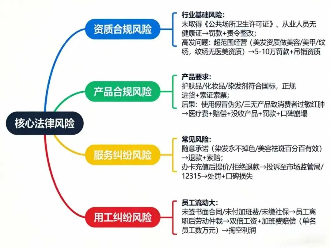 美容美发行业中小企业占比超 99%,核心法律风险与消费者体验、合规经营直接挂钩,且易引发舆情发酵:一是资质合规风险,这是行业基础风险,未取得《公共场所卫生许可证》、从业人员无健康证,将被监管部门罚款并责令整改;超范围经营是高发问题,如仅取得美发资质却开展美容、美甲、纹绣服务,纹绣等医美相关服务未取得医美资质,一旦被查,将面临 5-10 万元罚款,甚至吊销经营资质。二是产品合规风险,门店使用的护肤品、化妆品、染发剂需符合国家标准,且需有正规进货渠道、留存索证索票,若使用假冒伪劣、三无产品,导致消费者皮肤过敏、红肿,不仅需承担医疗费、赔偿责任,还会被监管部门没收产品并罚款,品牌口碑彻底崩塌。三是服务纠纷风险,这是行业最常见风险,老板为吸引顾客,随意承诺 “染发永不掉色”“美容祛斑百分百有效”,若服务效果不符承诺,消费者会要求退款、索赔;办卡充值后门店变相提价、拒绝退款,也会引发消费者投诉,甚至被投诉至市场监管局、12315,面临处罚和口碑损失。四是用工纠纷风险,美容美发行业员工流动性大,多数老板未与员工签订书面劳动合同、未支付加班费、未缴纳社保,员工离职后易申请劳动仲裁,主张双倍工资、加班费赔偿,单名员工的赔偿就可能达数万元,掏空门店利润。
