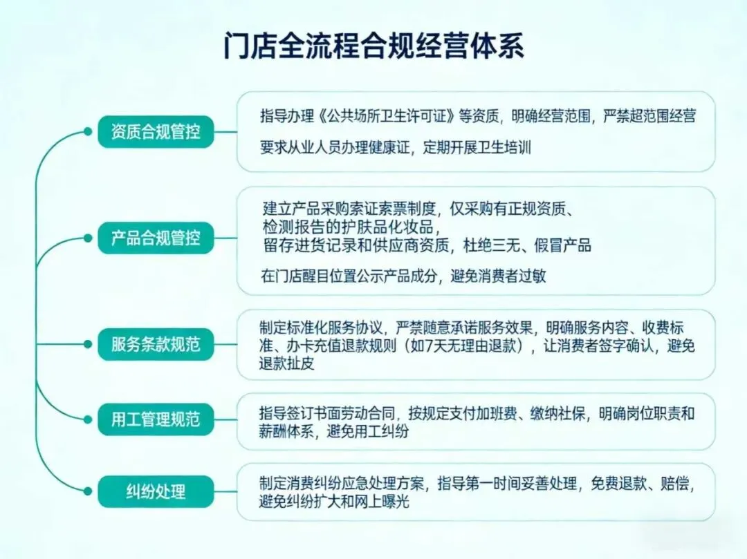 法律顾问入驻后,为门店搭建了全流程合规经营体系:一是资质合规管控,指导门店办理齐全《公共场所卫生许可证》等相关资质,明确经营范围,严禁超范围经营;要求所有从业人员办理健康证,定期开展卫生培训。二是产品合规管控,指导门店建立产品采购索证索票制度,仅采购有正规资质、检测报告的护肤品、化妆品,留存进货记录和供应商资质,杜绝三无、假冒产品;在门店醒目位置公示产品成分,避免消费者过敏。三是服务条款规范,制定标准化服务协议,严禁随意承诺服务效果,明确服务内容、收费标准、办卡充值退款规则(如 7 天无理由退款),让消费者签字确认,避免退款扯皮。四是用工管理规范,指导老板与所有员工签订书面劳动合同,按规定支付加班费、缴纳社保,明确员工岗位职责和薪酬体系,避免用工纠纷。五是纠纷处理,制定消费纠纷应急处理方案,指导门店在遇到消费者投诉时,第一时间妥善处理,免费退款、赔偿,避免纠纷扩大和网上曝光。