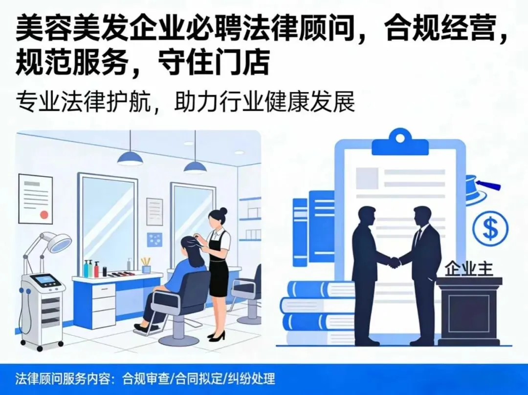 美容美发行业直接面向消费者,服务属性强、监管日趋严苛,核心法律风险集中在资质合规(超范围经营、从业人员无资质)、产品合规(假冒伪劣护肤品 / 化妆品)、服务纠纷(效果不符承诺、退款扯皮)、用工纠纷(未签合同、未付加班费)四大板块,叠加《化妆品监督管理条例》《劳动合同法》《消费者权益保护法》约束,一次消费者投诉、一场合规检查,就可能导致门店停业整改,甚至吊销经营资质。如同车主未交车险,美容美发企业无法律顾问,易陷入合规处罚、纠纷扯皮困境,一次突发问题就可能关停门店;聘请法律顾问,规范资质 / 产品合规、明确服务条款、处理用工关系,花小钱守住经营资质、规避门店关停风险,是美容美发中小企业的经营底线。