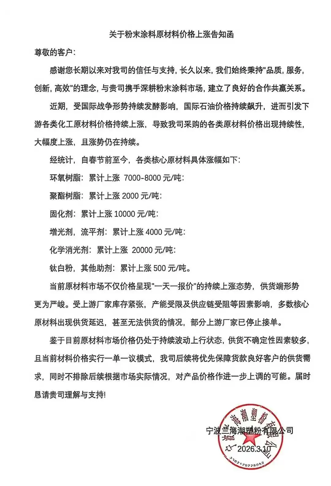 3月9日,浙江大桥油漆有限公司发布调价通知,由于国际原油价格暴涨,供货需求日趋紧张,导致化工原料价格一路飙升。公司决定从2026年3月16日下午16:30后对油漆产品上调价格,上调幅度暂定为3-5%,不排除进一步上调的可能。请各合作伙伴根据自身需求,安排好所需产品的备货,并在调价前报单给销售经理。