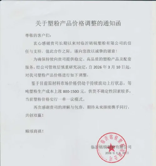 文安县开泰塑料制品有限公司发布通知称:因近期原材料价格大幅度上涨、生产成本增加、市场环境变化等因素影响,为保障产品、服务品质与后续稳定供应,经我司审慎研究,自2026年3月9日起,对部分产品服务价格进行调整,聚乙烯粉末每吨单价上涨500元。