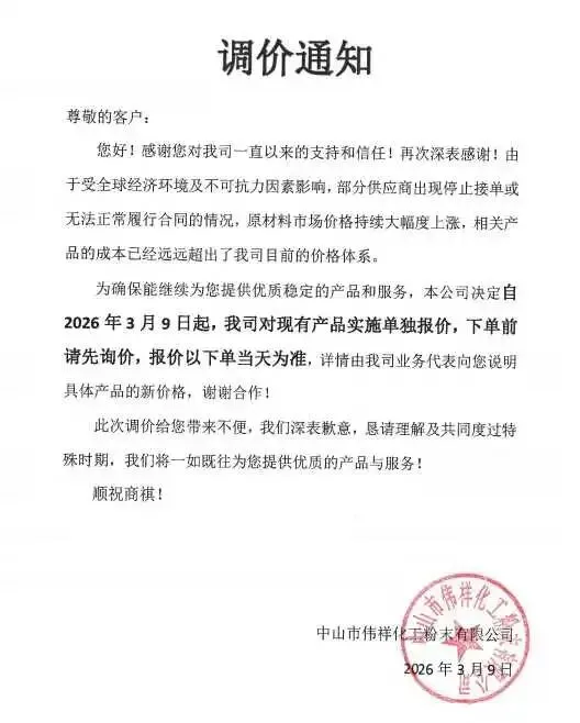 中山伟祥化工粉末有限公司发布调价通知称:为确保能继续为您提供优质稳定的产品和服务,本公司决定自2026年3月9日起,我司对现有产品实施单独报价,下单前请先询价,报价以下单当天为准。