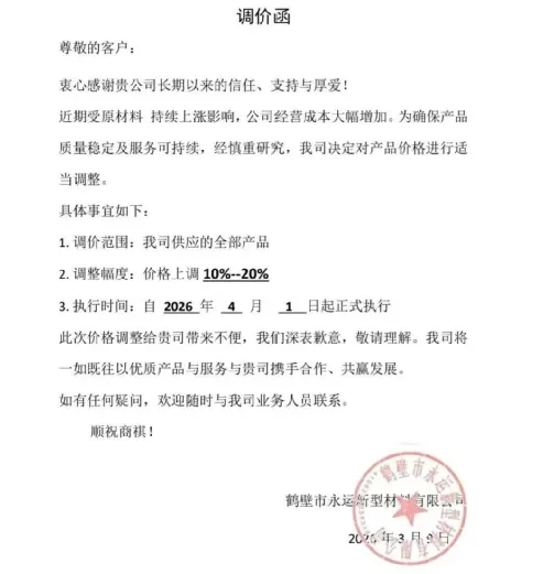 株洲飞鹿高新材料技术股份有限公司发布调价通知函称,鉴于当前国际贸易环境,沥青原油、树脂单体、异氰酸酯、有色金属及颜料钛白粉等各类防水防腐大宗原材料大幅涨价,涨价幅度达10-20%。公司本着以客户为中心的思想,一直在内部消化成本上涨带来的压力,始终保持产品品质不变,服务不变的准则。据国内外经济发展趋势,为保障广大客户、合作伙伴的长远利益,公司经研究决定,自2026年3月10日起对全线产品价格进行调整,各类产品价格调整如下: