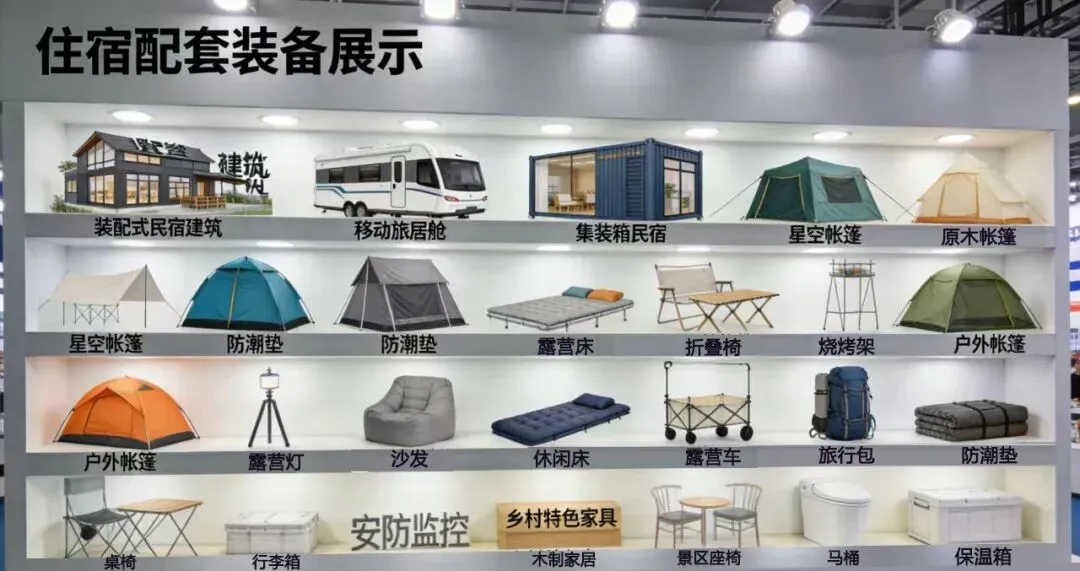 住宿配套装备:装配式民宿建筑、移动旅居舱、集装箱民宿、星空帐篷、防潮垫、露营桌椅、户外帐篷、睡袋、智能门锁、节能照明、温控系统、安防监控、乡村特色家具、卫浴洁具、节能供水设备等。