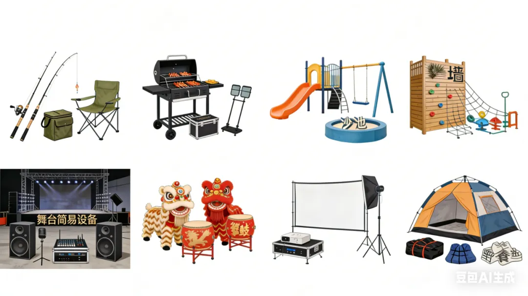 休闲娱乐装备:乡村垂钓设备、户外烧烤器具、亲子游乐设施、户外拓展器材、舞台简易设备、音响灯光、民俗表演道具、户外投影设备、露营娱乐器材等。