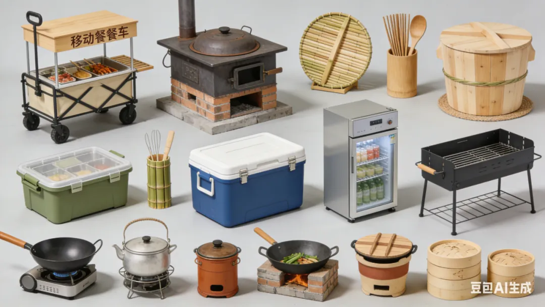 餐饮配套装备:移动餐车、土灶台、柴火灶、竹制餐具、小型冷藏柜、保鲜箱、户外便携炊具、节水洗碗设备、农产品加工简易设备、特色餐饮容器器等。