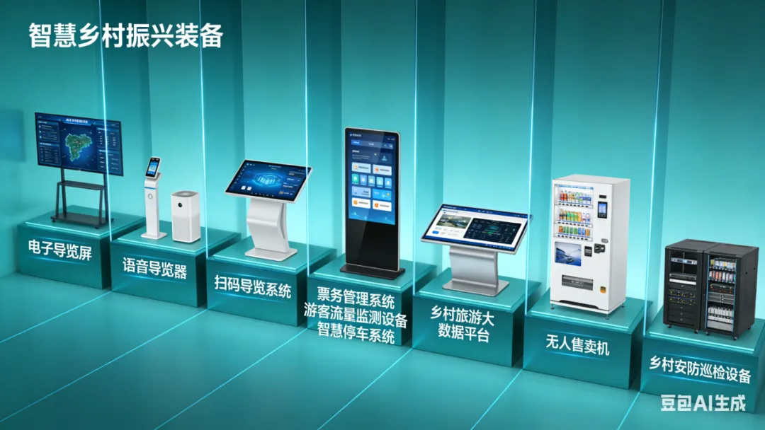 智慧乡村旅游装备:电子导览屏、语音导览器、扫码导览系统、票务管理系统、游客流量监测设备、乡村旅游大数据平台、智慧停车系统、无人售卖机、乡村安防巡检设备等。