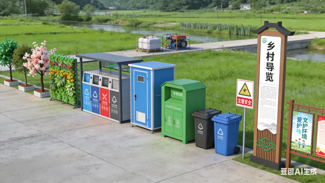 景观与环境装备:乡村绿化苗木、仿真花树、仿真绿植墙、垃圾分类处理设备、环保厕所、户外垃圾桶、导览牌、警示牌、文化宣传牌、河道治理简易设备等。