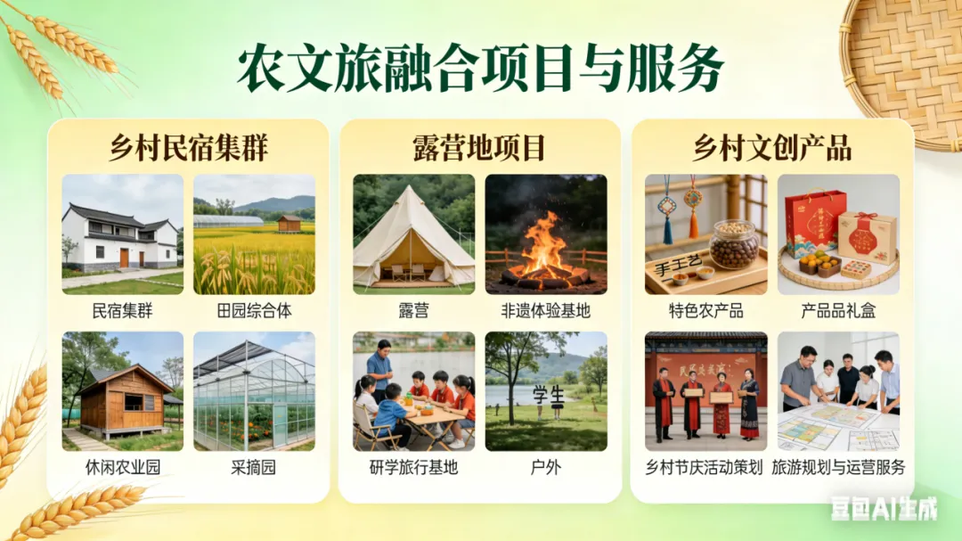 农文旅融合项目与服务:乡村民宿集群、田园综合体、休闲农业园、露营地项目、非遗体验基地、研学旅行基地、乡村文创产品、特色农产品、乡村节庆活动策划、旅游规划与运营服务等。