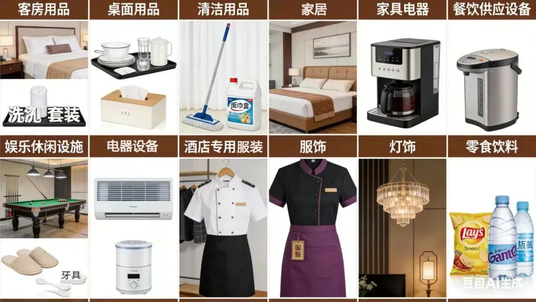 酒店用品与食品饮料:客房用品、桌面用品、清洁用品、家具用品、餐饮供应设备、娱乐休闲设施、一次性用品、酒店专用电器、灯饰、服饰、零食饮料等。