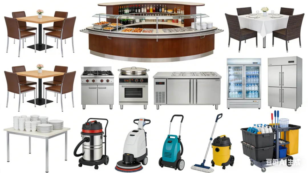 家具家电与清洁设备:中西餐桌椅、吧台、取餐台、宴会桌等,商用炉灶、蒸烤箱、洗碗机、冰柜、消毒柜、储存设备,洗地机、扫地机、吸尘器、高压清洗机、清洁工具套装等。