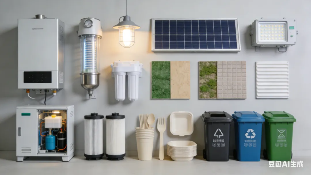 环保与节能产品:空气净化设备、水处理系统、节能照明、可再生能源应用、环保建材、可降解一次性用品、垃圾分类处理设备等。