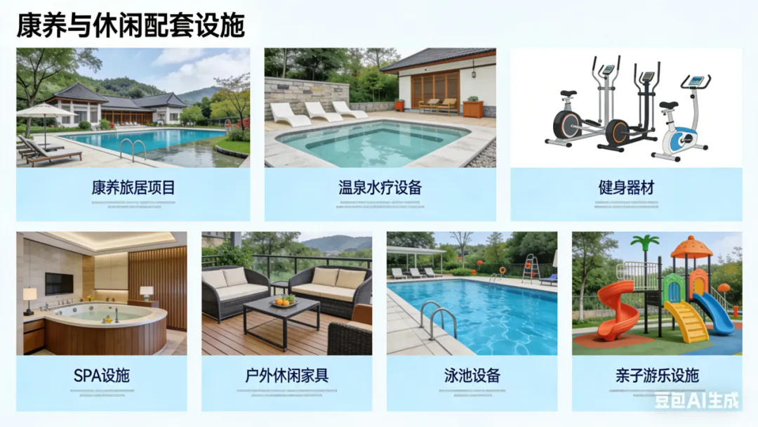 康养与休闲配套:康养旅居项目、温泉水疗设备、健身器材、SPA设施、户外休闲家具、泳池设备、亲子游乐设施等。