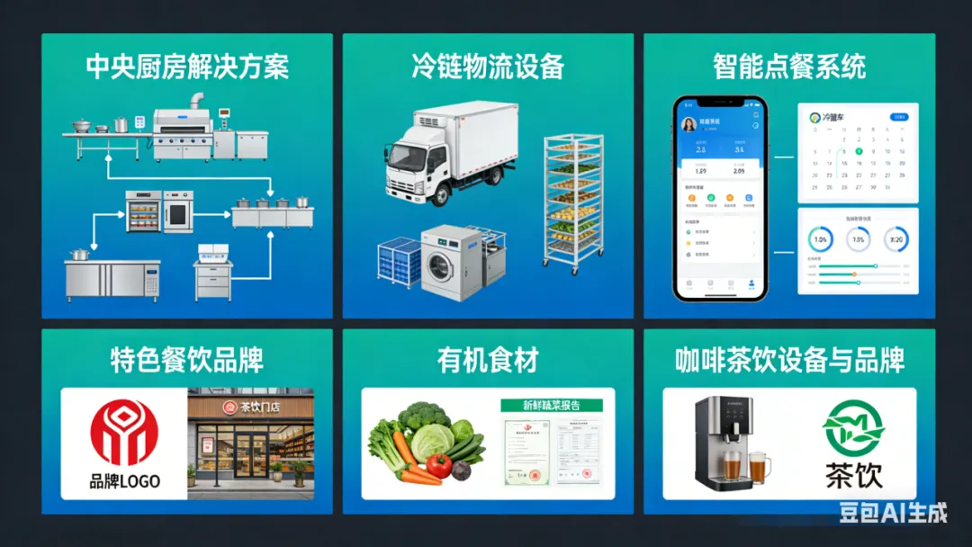 供应链与餐饮配套:中央厨房解决方案、冷链物流设备、智能点餐系统、特色餐饮品牌、有机食材、咖啡茶饮设备与品牌等。