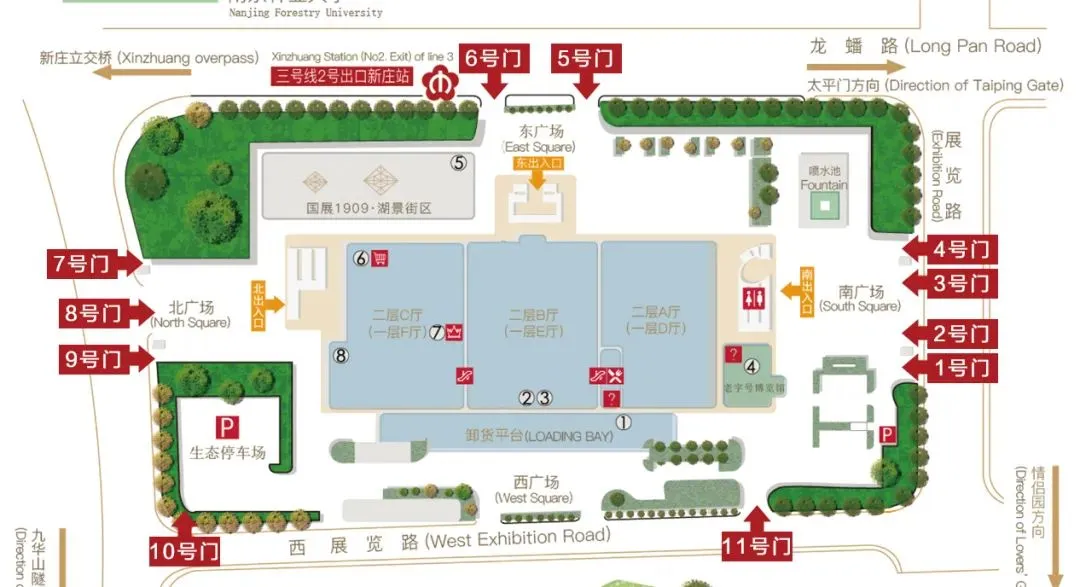 E:杭州方向:长深高速→应天大街高架→大校场隧道→内环东线→九华山隧道→龙蟠路→展馆路→南京国际展览中心 11 号门(南门)