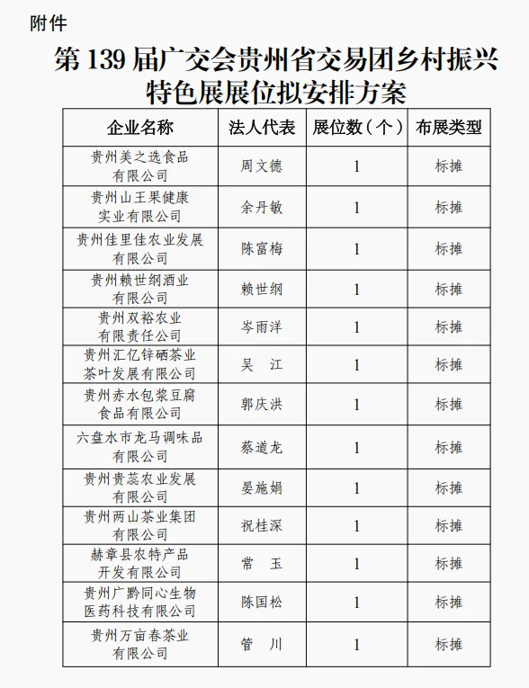 为扎实做好第139届中国进出口商品交易会(以下简称广交会)贵州省交易团参展相关工作,根据《中国进出口商品交易会关于印发<中国进出口商品交易会出口展一般性展位数量安排办法>的通知》(会字〔2026〕2号)、《中国进出口商品交易会出口展贵州省交易团一般性展位数量安排和使用管理办法》等文件精神,基于企业自愿申请及往届参展情况,结合各地商务主管部门推荐意见,经研究,现将第139届广交会贵州省交易团乡村振兴特色展展位拟安排方案予以公示(见附件),公示时间为2026年3月13日至19日。