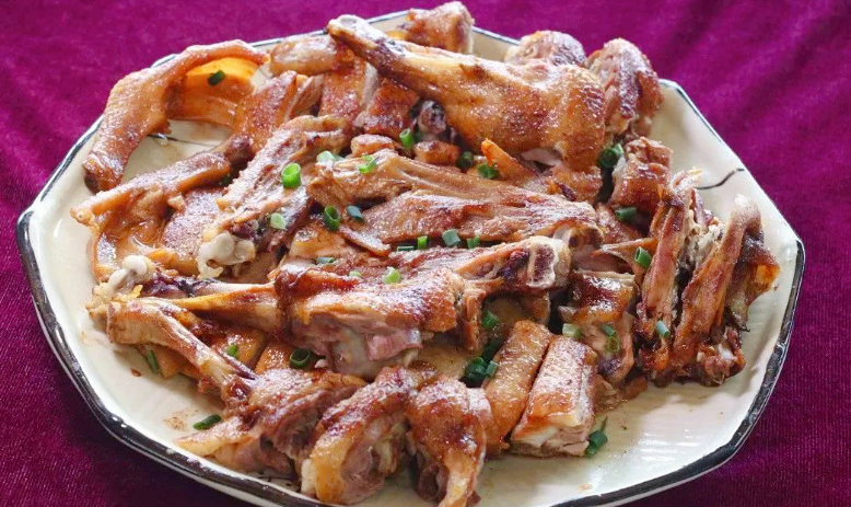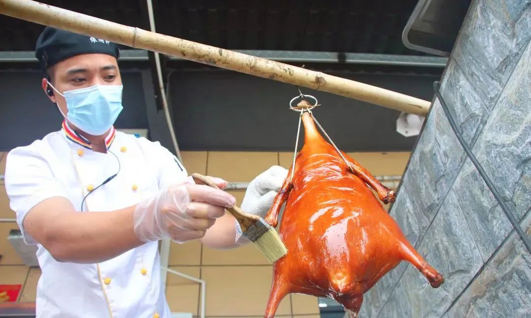 依湖轩餐厅出品的烧鹅色泽鲜明,香味四溢,皮脆而不焦,又厚又脆的烧鹅皮夹着鲜嫩多汁的肉,肉酥松软,甜嫩离骨,配上酸梅酱,十分可口。