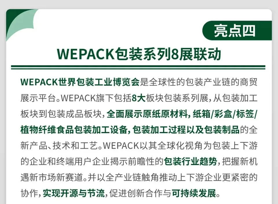 中国包装联合会和励展博览集团强强联合,共同打造的全品种包装容器展示平台集中展示纸、塑、金属、玻璃等材料的包装及容器,汇集创新包装材料、包装结构、包装设计以及整体包装解决方案,是代表我国包装发展新趋势和创新包装服务大平台。