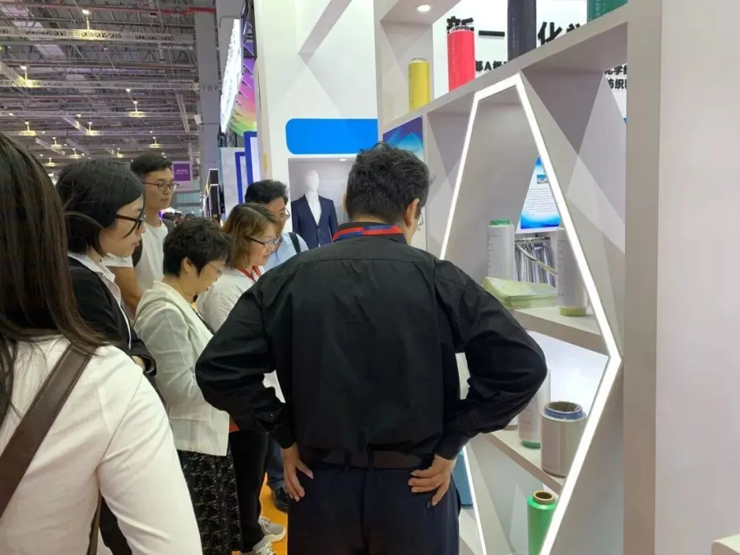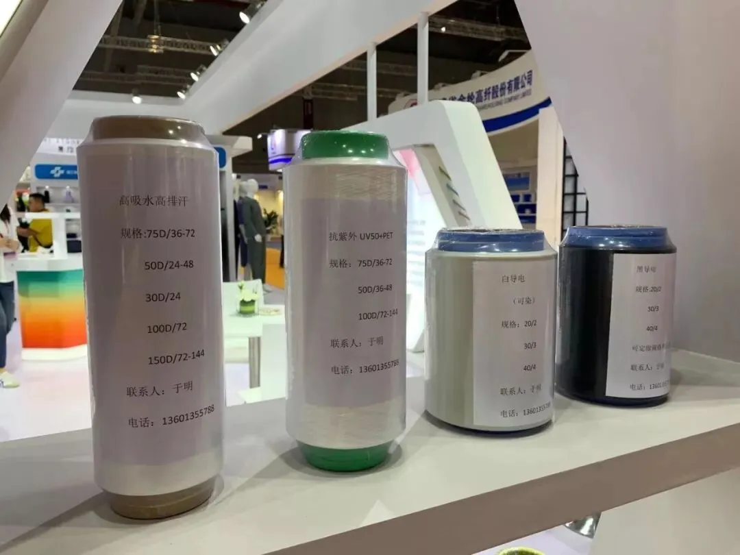 中纺院 ( 天津 ) 科技发展有限公司拥有集聚合物合成与改性、熔融纺、溶液纺、纤维/ 功能膜/ 非织造布加工、分析测试为一体,可实现纤维材料从应用基础研究到工程化、产业化技术配套开发的中试创新平台。目前已建成并打通“聚合—纺丝—加弹”产业链,本次展出的是公司的一些具有功能性的原液着色色丝,现场也有很多感兴趣的客户上前交流沟通。