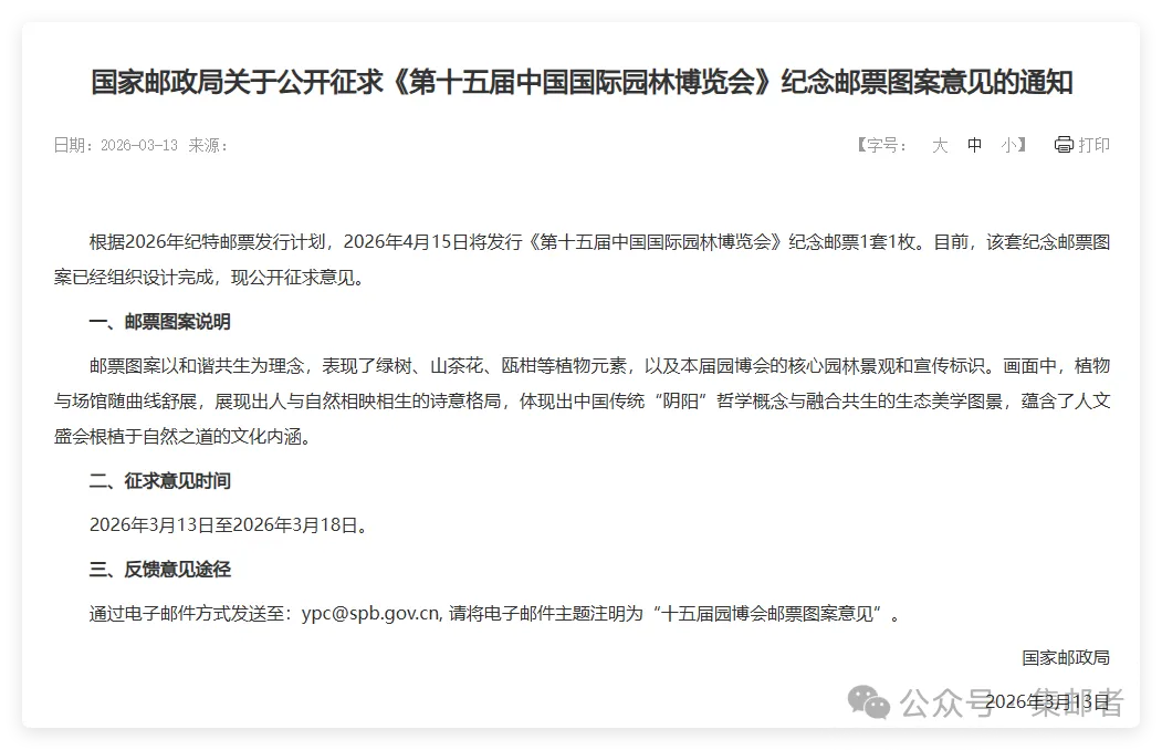 通过电子邮件方式发送至:ypc@spb.gov.cn, 请将电子邮件主题注明为“十五届园博会邮票图案意见”。