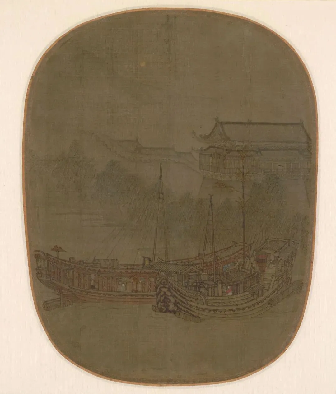 朦胧月色之中,两艘大船停泊在城下,岸上烟柳拂堤,城楼高耸,一带城垣与几处屋顶笼罩在月色与夜霭之中,与朦胧的远山融为一体。城墙之内的人家还在安睡,而船中之人已经起身收拾准备,迎接新的一天的忙碌。